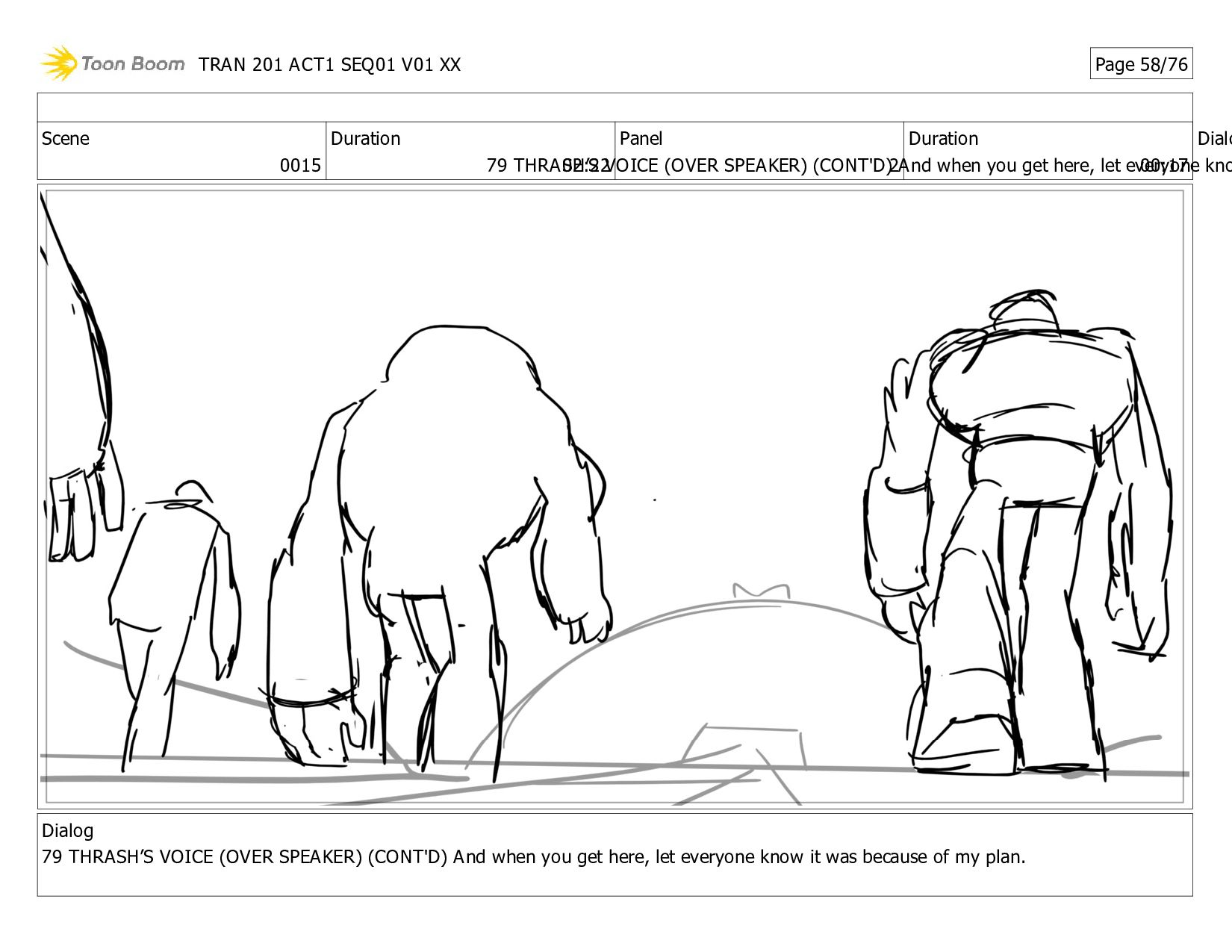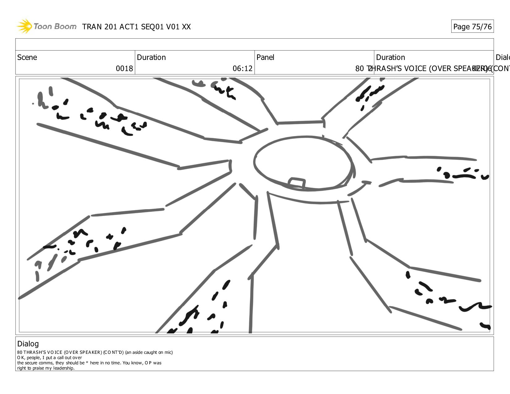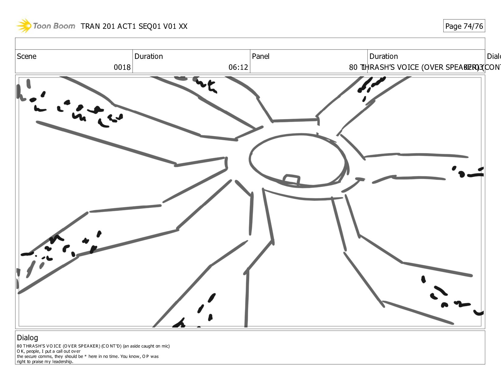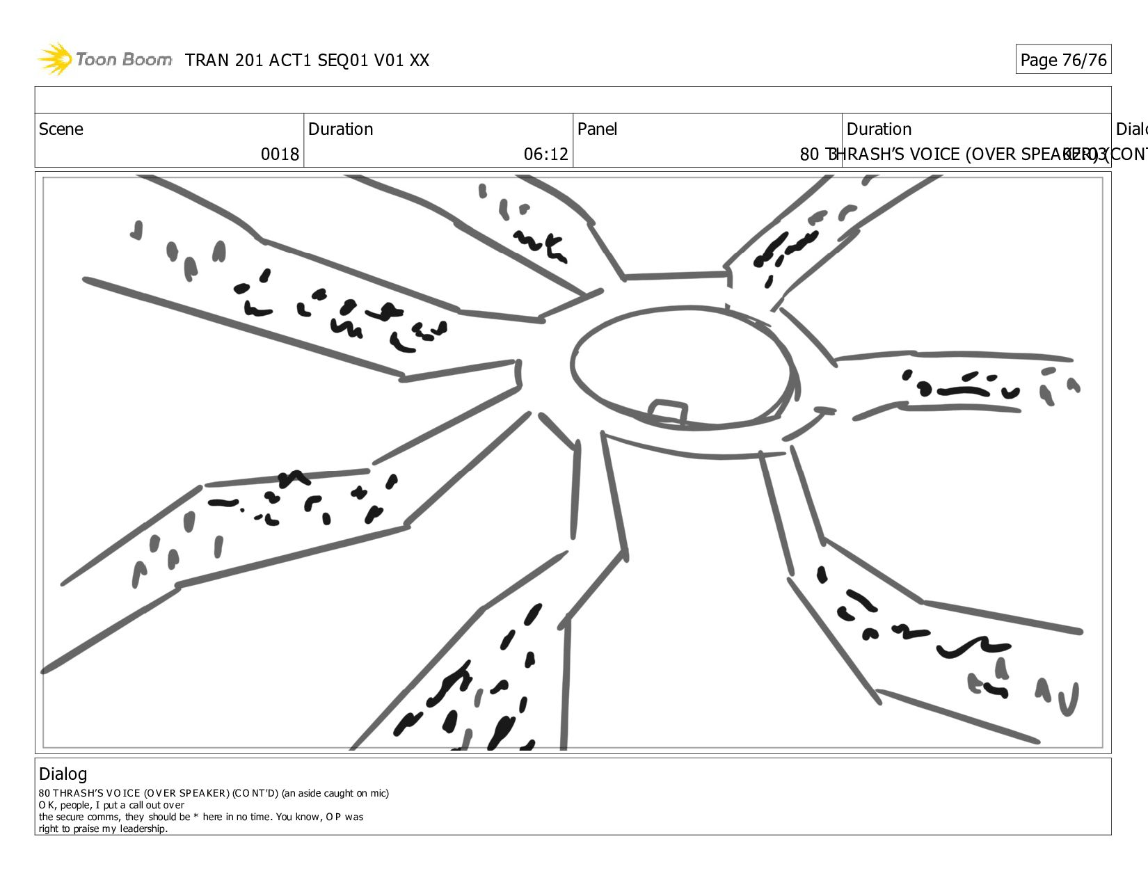 THRASH’S VOICE (OVER SPEAKER) (CONT OK the secure comms, they should be * here i r Dialog 80 THRASH’S VOICE (OVER SPEAKER) (CONT'D) (an aside caught on mic) OK, people, I put a call out over the secure comms, they should be * here in no time. You know, OP was right to praise my leadership. TRAN 201 ACT1 SEQ01 V01 XX Page 74/76