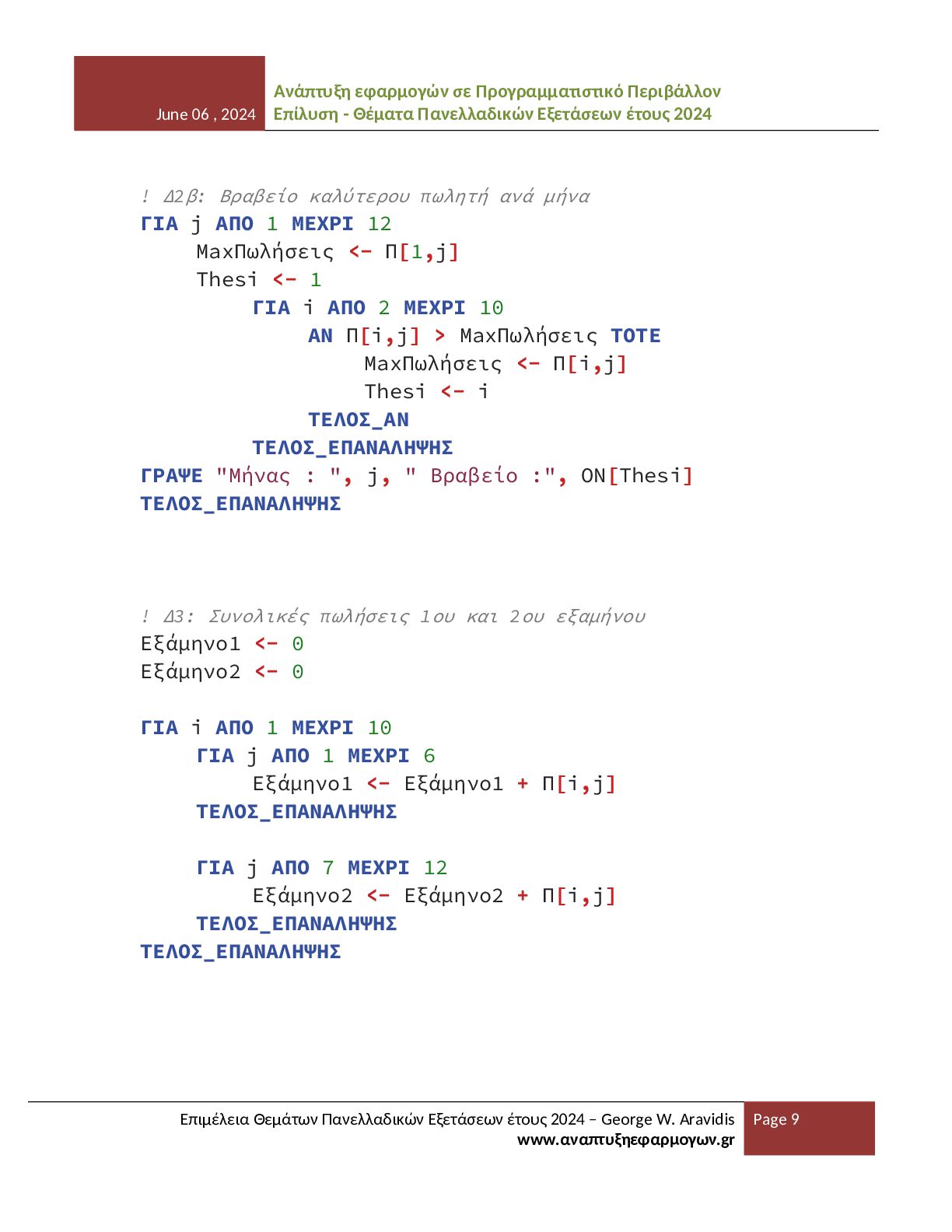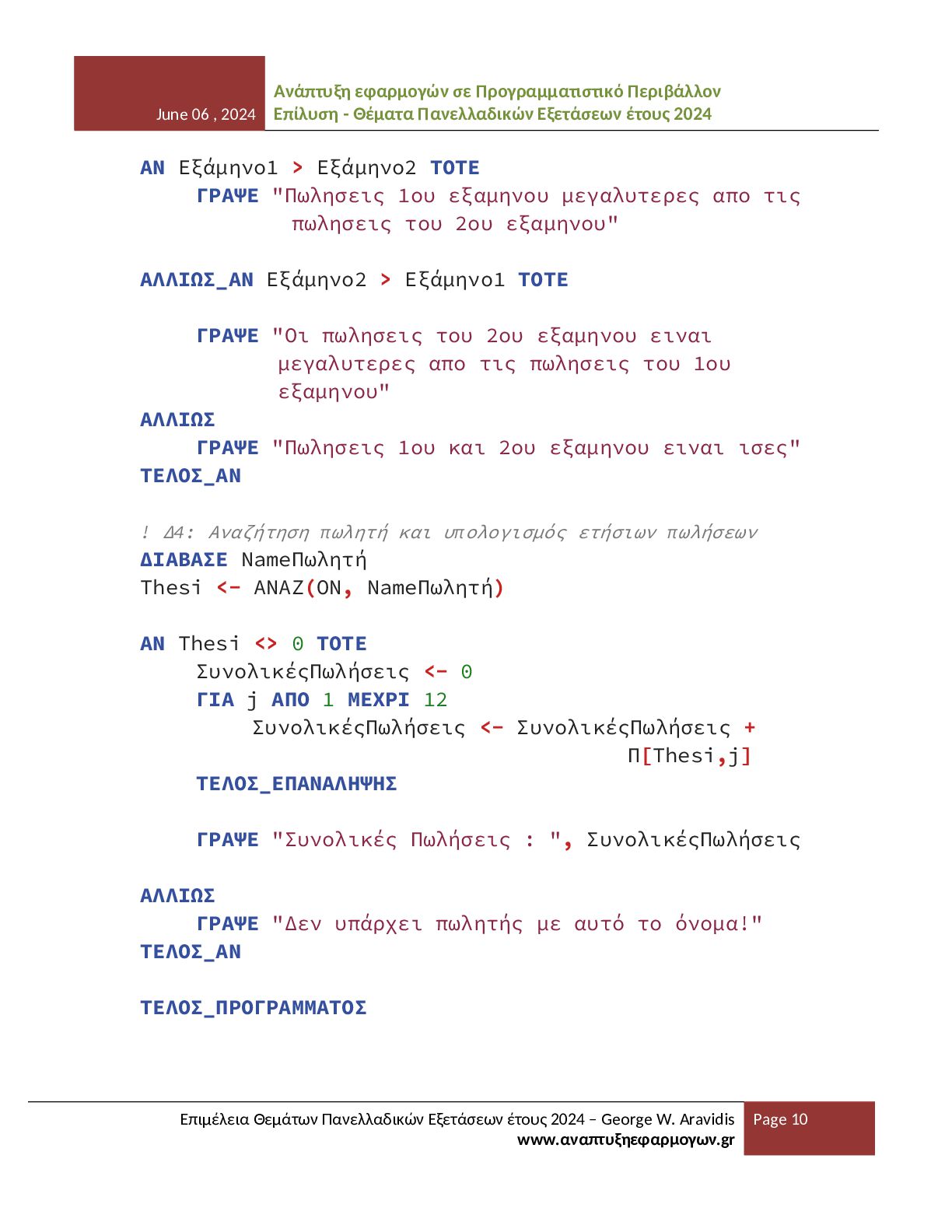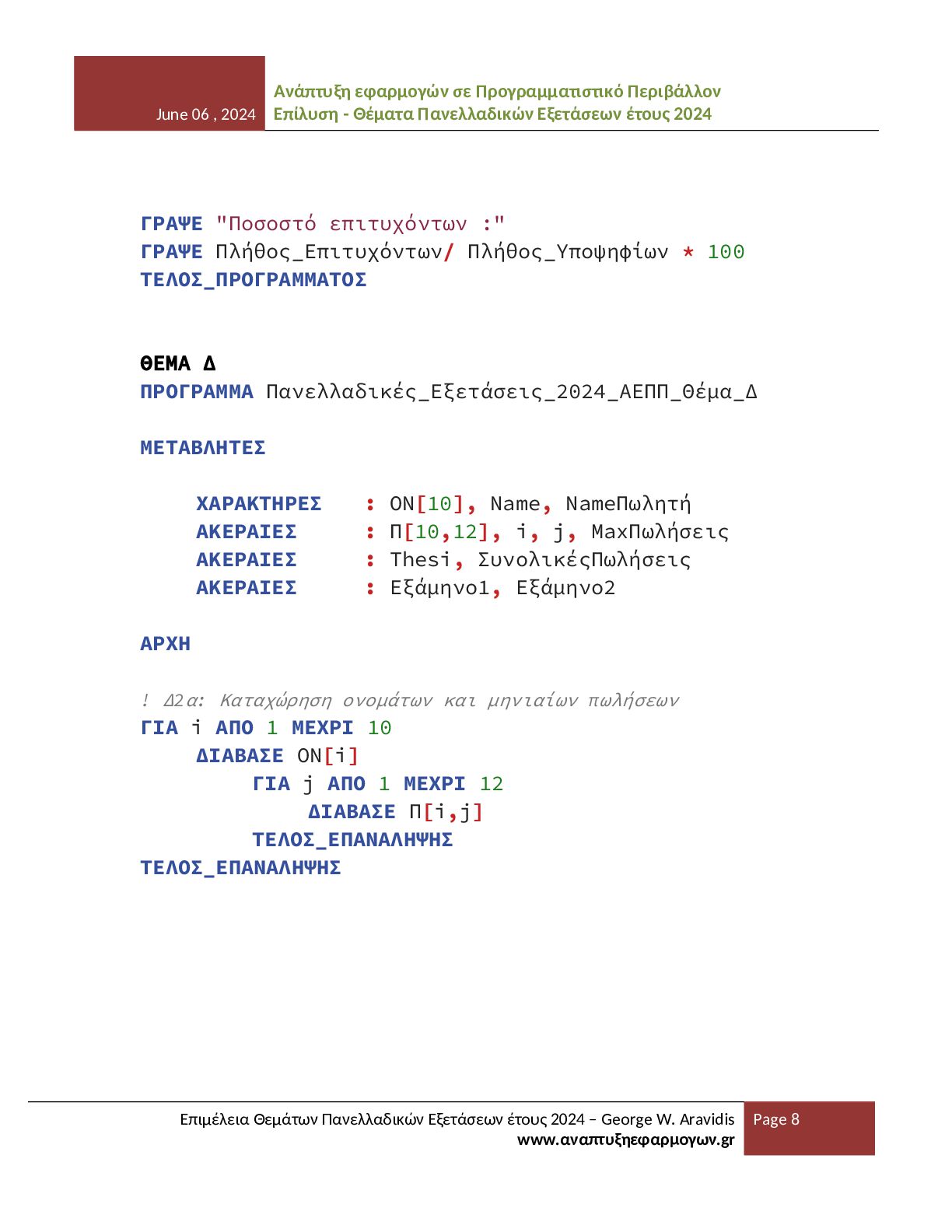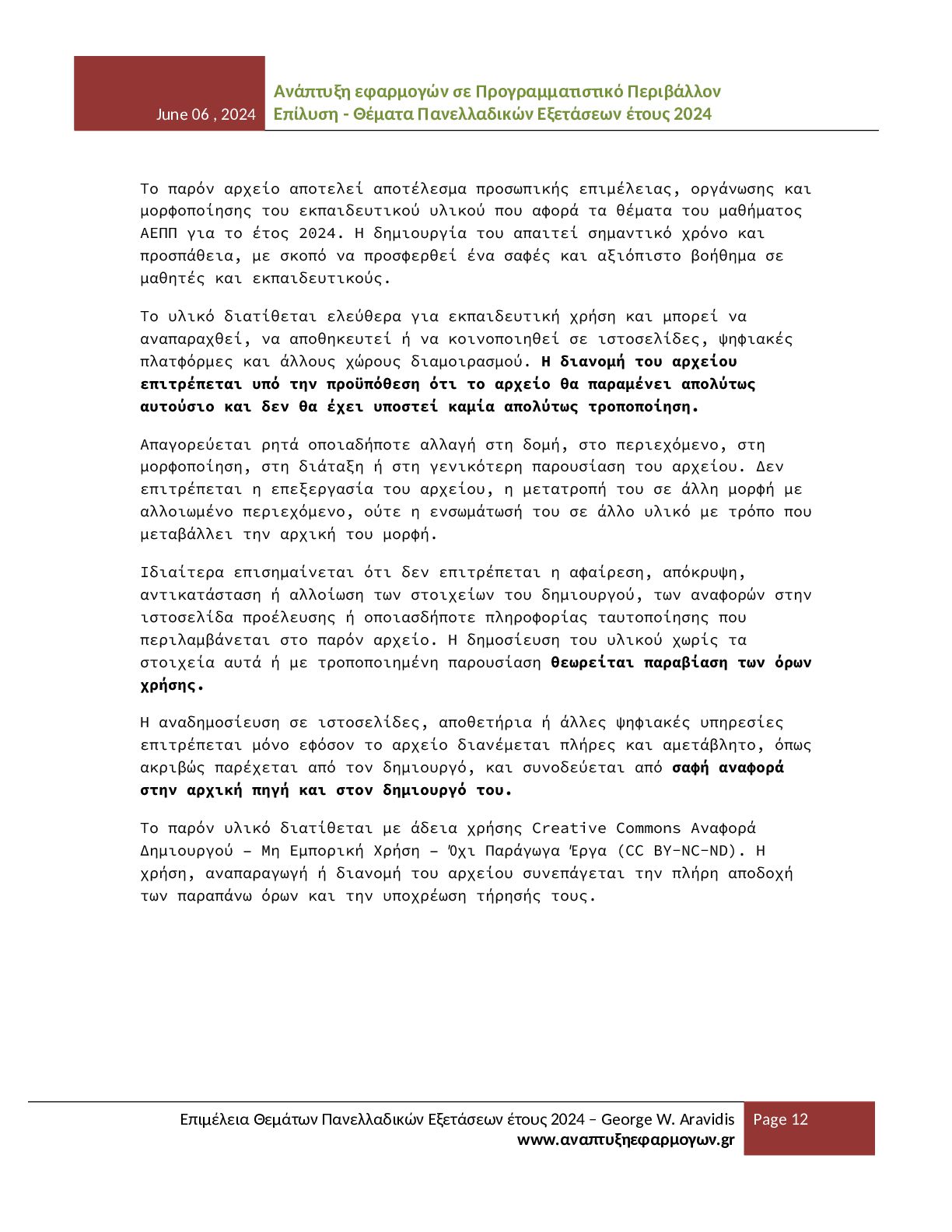 - Θέματα Πανελλαδικών Εξετάσεων έτους 2024 Επιμέλεια Θεμάτων Πανελλαδικών Εξετάσεων έτους 2024 – George W. Aravidis www.αναπτυξηεφαρμογων.gr Page 12 Το παρόν αρχείο αποτελεί αποτέλεσμα προσωπικής επιμέλειας, οργάνωσης και μορφοποίησης του εκπαιδευτικού υλικού που αφορά τα θέματα του μαθήματος ΑΕΠΠ για το έτος 2024. Η δημιουργία του απαιτεί σημαντικό χρόνο και προσπάθεια, με σκοπό να προσφερθεί ένα σαφές και αξιόπιστο βοήθημα σε μαθητές και εκπαιδευτικούς. Το υλικό διατίθεται ελεύθερα για εκπαιδευτική χρήση και μπορεί να αναπαραχθεί, να αποθηκευτεί ή να κοινοποιηθεί σε ιστοσελίδες, ψηφιακές πλατφόρμες και άλλους χώρους διαμοιρασμού. Η διανομή του αρχείου επιτρέπεται υπό την προϋπόθεση ότι το αρχείο θα παραμένει απολύτως αυτούσιο και δεν θα έχει υποστεί καμία απολύτως τροποποίηση. Απαγορεύεται ρητά οποιαδήποτε αλλαγή στη δομή, στο περιεχόμενο, στη μορφοποίηση, στη διάταξη ή στη γενικότερη παρουσίαση του αρχείου. Δεν επιτρέπεται η επεξεργασία του αρχείου, η μετατροπή του σε άλλη μορφή με αλλοιωμένο περιεχόμενο, ούτε η ενσωμάτωσή του σε άλλο υλικό με τρόπο που μεταβάλλει την αρχική του μορφή. Ιδιαίτερα επισημαίνεται ότι δεν επιτρέπεται η αφαίρεση, απόκρυψη, αντικατάσταση ή αλλοίωση των στοιχείων του δημιουργού, των αναφορών στην ιστοσελίδα προέλευσης ή οποιασδήποτε πληροφορίας ταυτοποίησης που περιλαμβάνεται στο παρόν αρχείο. Η δημοσίευση του υλικού χωρίς τα στοιχεία αυτά ή με τροποποιημένη παρουσίαση θεωρείται παραβίαση των όρων χρήσης. Η αναδημοσίευση σε ιστοσελίδες, αποθετήρια ή άλλες ψηφιακές υπηρεσίες επιτρέπεται μόνο εφόσον το αρχείο διανέμεται πλήρες και αμετάβλητο, όπως ακριβώς παρέχεται από τον δημιουργό, και συνοδεύεται από σαφή αναφορά στην αρχική πηγή και στον δημιουργό του. Το παρόν υλικό διατίθεται με άδεια χρήσης Creative Commons Αναφορά Δημιουργού – Μη Εμπορική Χρήση – Όχι Παράγωγα Έργα (CC BY-NC-ND). Η χρήση, αναπαραγωγή ή διανομή του αρχείου συνεπάγεται την πλήρη αποδοχή των παραπάνω όρων και την υποχρέωση τήρησής τους.