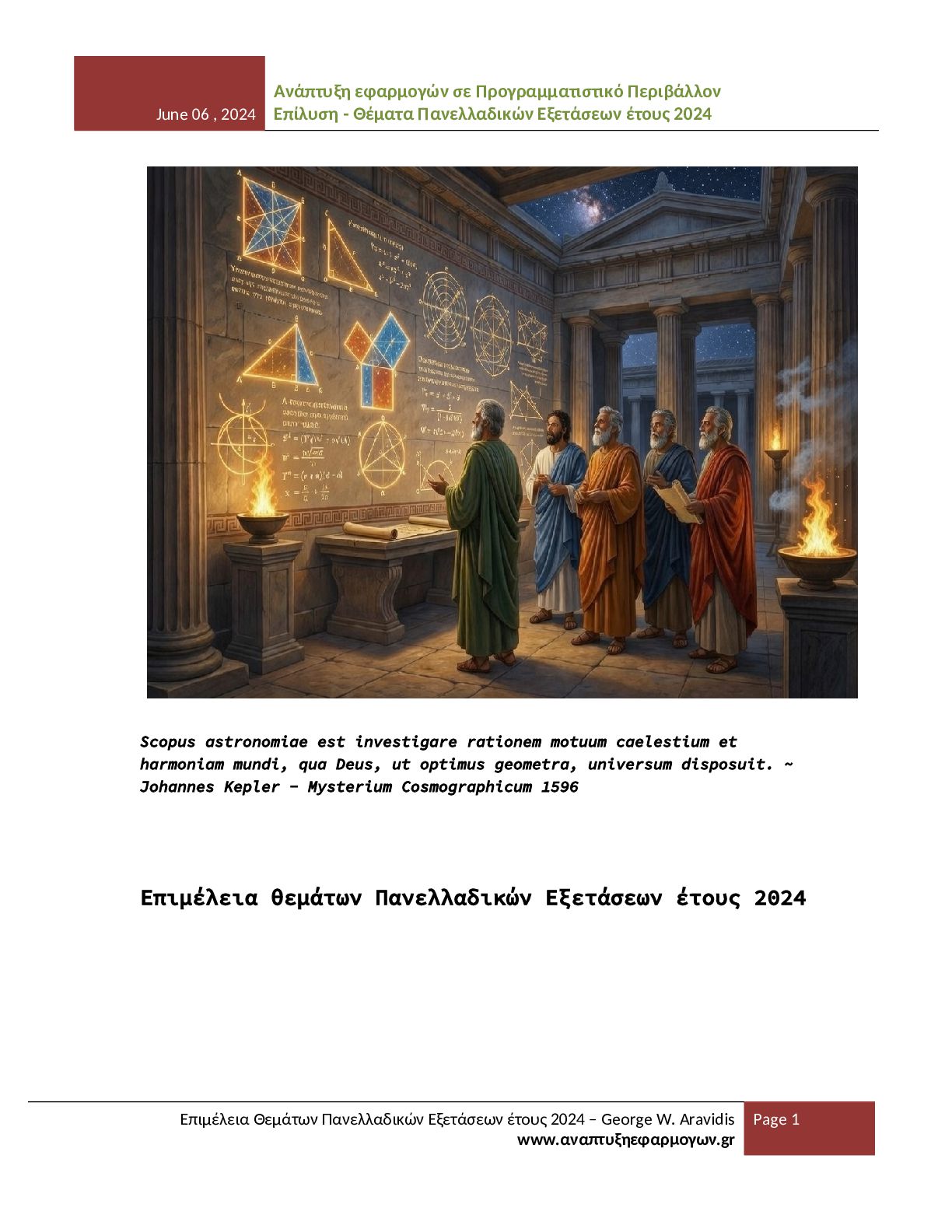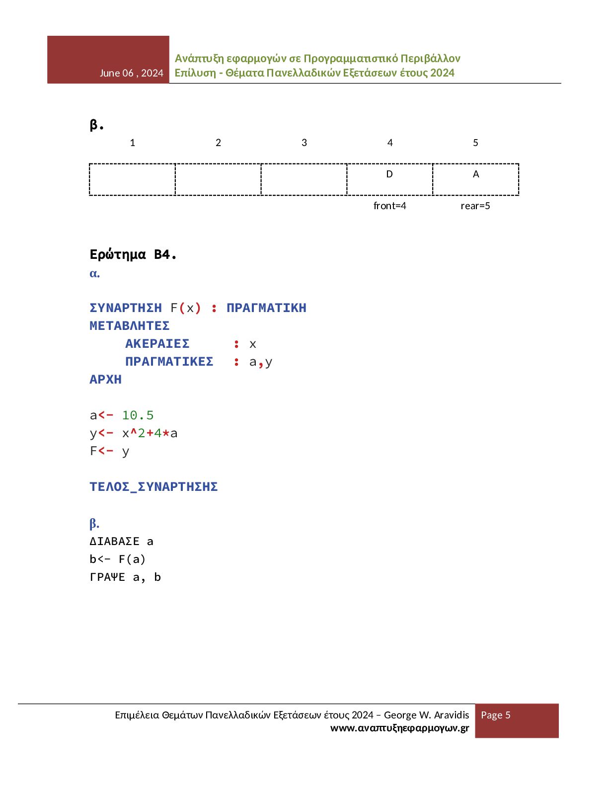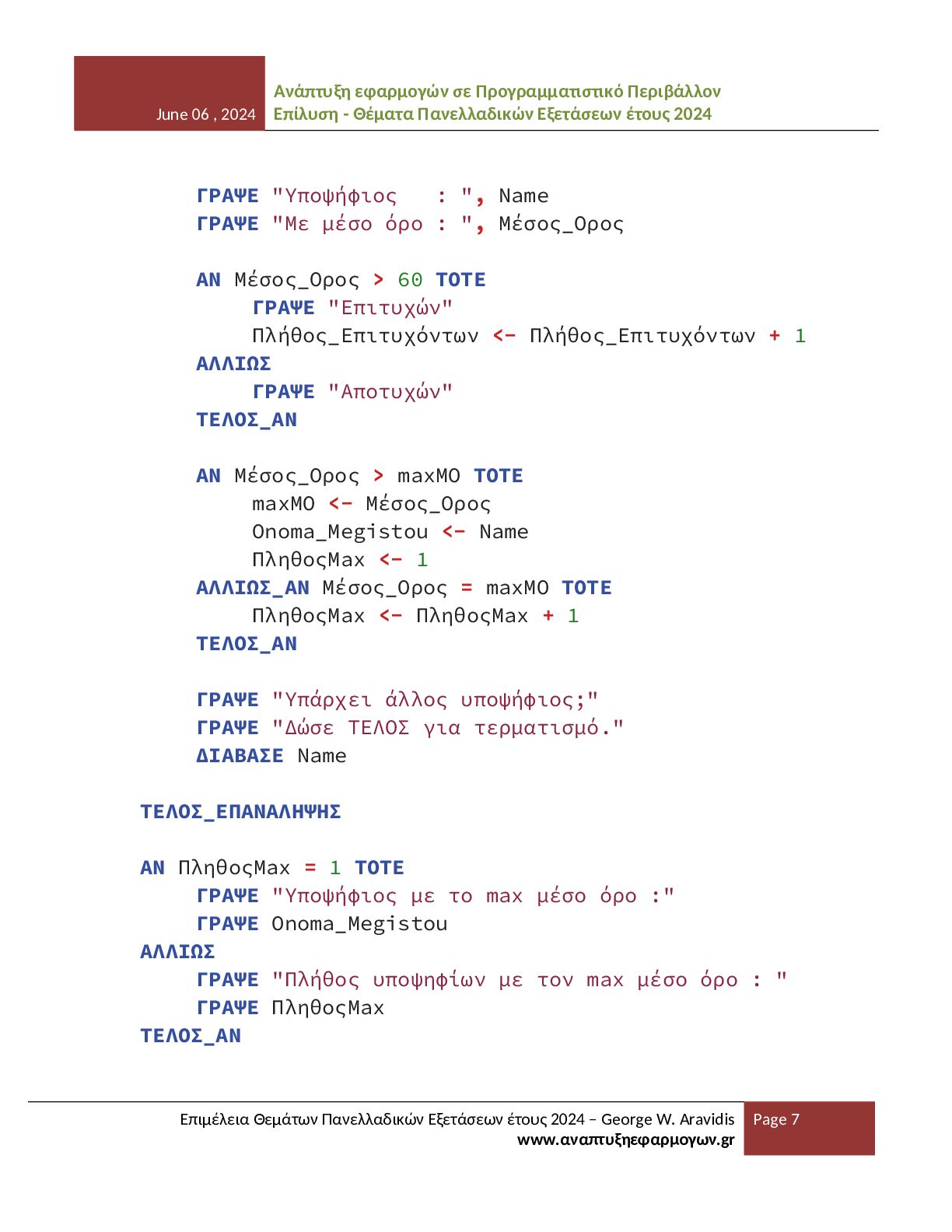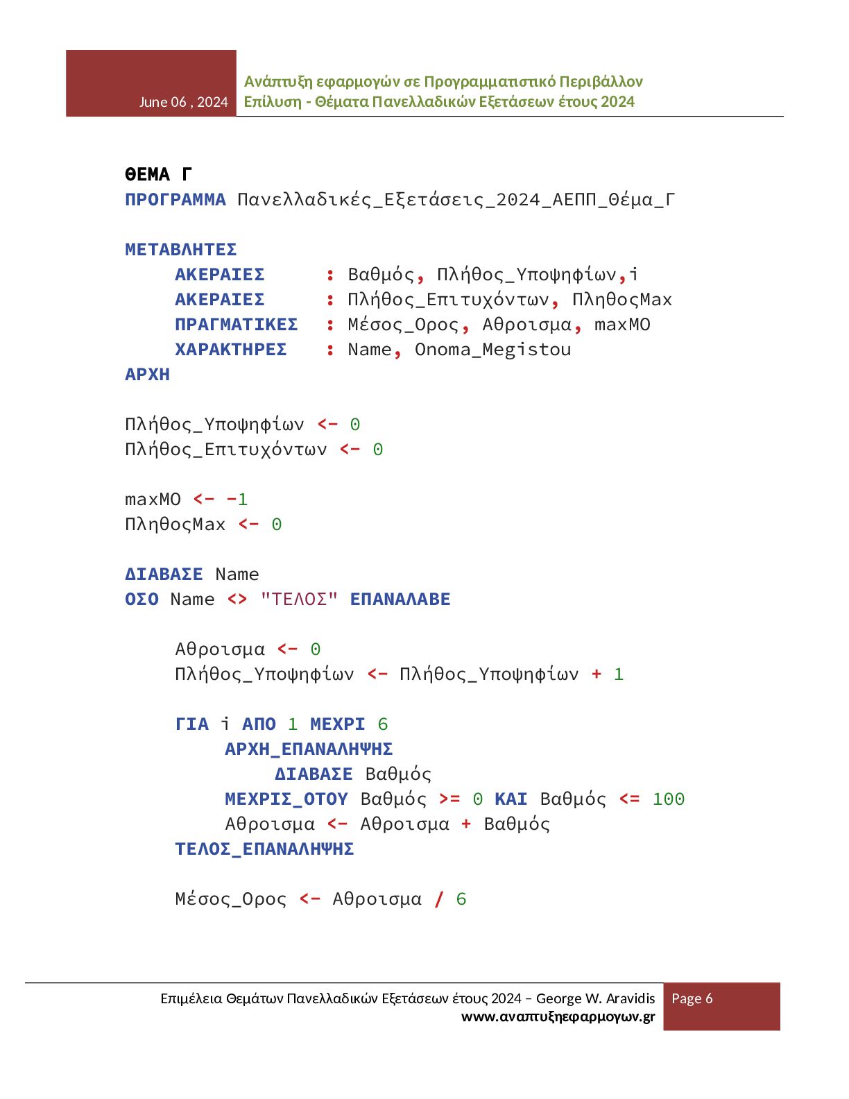 - Θέματα Πανελλαδικών Εξετάσεων έτους 2024 Επιμέλεια Θεμάτων Πανελλαδικών Εξετάσεων έτους 2024 – George W. Aravidis www.αναπτυξηεφαρμογων.gr Page 12 Το παρόν αρχείο αποτελεί αποτέλεσμα προσωπικής επιμέλειας, οργάνωσης και μορφοποίησης του εκπαιδευτικού υλικού που αφορά τα θέματα του μαθήματος ΑΕΠΠ για το έτος 2024. Η δημιουργία του απαιτεί σημαντικό χρόνο και προσπάθεια, με σκοπό να προσφερθεί ένα σαφές και αξιόπιστο βοήθημα σε μαθητές και εκπαιδευτικούς. Το υλικό διατίθεται ελεύθερα για εκπαιδευτική χρήση και μπορεί να αναπαραχθεί, να αποθηκευτεί ή να κοινοποιηθεί σε ιστοσελίδες, ψηφιακές πλατφόρμες και άλλους χώρους διαμοιρασμού. Η διανομή του αρχείου επιτρέπεται υπό την προϋπόθεση ότι το αρχείο θα παραμένει απολύτως αυτούσιο και δεν θα έχει υποστεί καμία απολύτως τροποποίηση. Απαγορεύεται ρητά οποιαδήποτε αλλαγή στη δομή, στο περιεχόμενο, στη μορφοποίηση, στη διάταξη ή στη γενικότερη παρουσίαση του αρχείου. Δεν επιτρέπεται η επεξεργασία του αρχείου, η μετατροπή του σε άλλη μορφή με αλλοιωμένο περιεχόμενο, ούτε η ενσωμάτωσή του σε άλλο υλικό με τρόπο που μεταβάλλει την αρχική του μορφή. Ιδιαίτερα επισημαίνεται ότι δεν επιτρέπεται η αφαίρεση, απόκρυψη, αντικατάσταση ή αλλοίωση των στοιχείων του δημιουργού, των αναφορών στην ιστοσελίδα προέλευσης ή οποιασδήποτε πληροφορίας ταυτοποίησης που περιλαμβάνεται στο παρόν αρχείο. Η δημοσίευση του υλικού χωρίς τα στοιχεία αυτά ή με τροποποιημένη παρουσίαση θεωρείται παραβίαση των όρων χρήσης. Η αναδημοσίευση σε ιστοσελίδες, αποθετήρια ή άλλες ψηφιακές υπηρεσίες επιτρέπεται μόνο εφόσον το αρχείο διανέμεται πλήρες και αμετάβλητο, όπως ακριβώς παρέχεται από τον δημιουργό, και συνοδεύεται από σαφή αναφορά στην αρχική πηγή και στον δημιουργό του. Το παρόν υλικό διατίθεται με άδεια χρήσης Creative Commons Αναφορά Δημιουργού – Μη Εμπορική Χρήση – Όχι Παράγωγα Έργα (CC BY-NC-ND). Η χρήση, αναπαραγωγή ή διανομή του αρχείου συνεπάγεται την πλήρη αποδοχή των παραπάνω όρων και την υποχρέωση τήρησής τους.