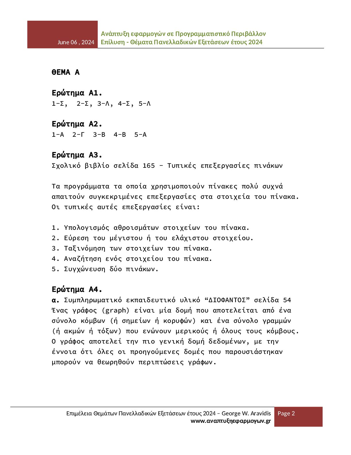 - Θέματα Πανελλαδικών Εξετάσεων έτους 2024 Επιμέλεια Θεμάτων Πανελλαδικών Εξετάσεων έτους 2024 – George W. Aravidis www.αναπτυξηεφαρμογων.gr Page 2 ΘΕΜΑ Α Ερώτημα Α1. 1-Σ, 2-Σ, 3-Λ, 4-Σ, 5-Λ Ερώτημα Α2. 1-Α 2-Γ 3-Β 4-Β 5-Α Ερώτημα Α3. Σχολικό βιβλίο σελίδα 165 - Τυπικές επεξεργασίες πινάκων Τα προγράμματα τα οποία χρησιμοποιούν πίνακες πολύ συχνά απαιτούν συγκεκριμένες επεξεργασίες στα στοιχεία του πίνακα. Οι τυπικές αυτές επεξεργασίες είναι: 1. Υπολογισμός αθροισμάτων στοιχείων του πίνακα. 2. Εύρεση του μέγιστου ή του ελάχιστου στοιχείου. 3. Ταξινόμηση των στοιχείων του πίνακα. 4. Αναζήτηση ενός στοιχείου του πίνακα. 5. Συγχώνευση δύο πινάκων. Ερώτημα Α4. α. Συμπληρωματικό εκπαιδευτικό υλικό “ΔΙΟΦΑΝΤΟΣ” σελίδα 54 Ένας γράφος (graph) είναι μία δομή που αποτελείται από ένα σύνολο κόμβων (ή σημείων ή κορυφών) και ένα σύνολο γραμμών (ή ακμών ή τόξων) που ενώνουν μερικούς ή όλους τους κόμβους. Ο γράφος αποτελεί την πιο γενική δομή δεδομένων, με την έννοια ότι όλες οι προηγούμενες δομές που παρουσιάστηκαν μπορούν να θεωρηθούν περιπτώσεις γράφων.