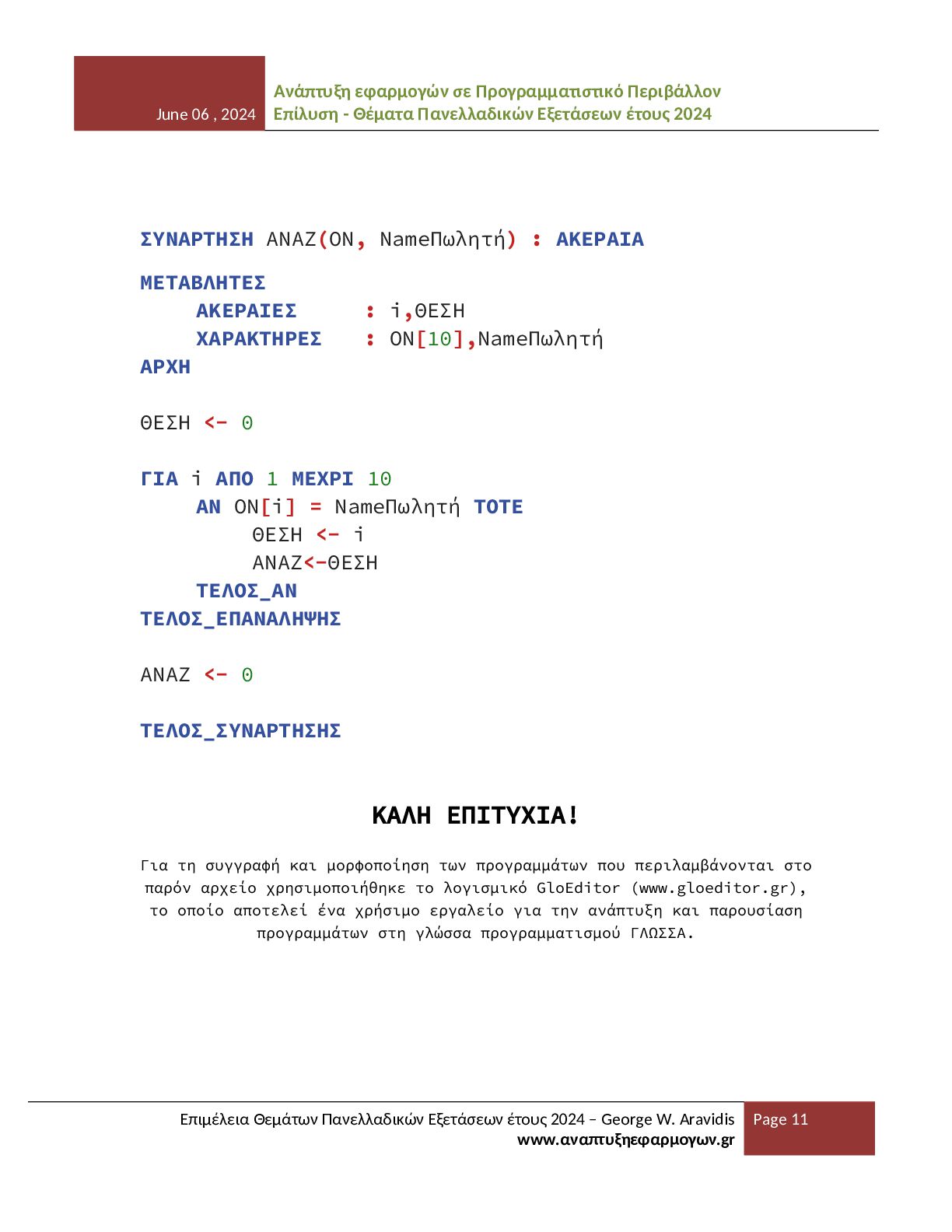 - Θέματα Πανελλαδικών Εξετάσεων έτους 2024 Επιμέλεια Θεμάτων Πανελλαδικών Εξετάσεων έτους 2024 – George W. Aravidis www.αναπτυξηεφαρμογων.gr Page 11 ΣΥΝΑΡΤΗΣΗ ΑΝΑΖ(ON, NameΠωλητή) : ΑΚΕΡΑΙΑ ΜΕΤΑΒΛΗΤΕΣ ΑΚΕΡΑΙΕΣ : i,ΘΕΣΗ ΧΑΡΑΚΤΗΡΕΣ : ON[10],NameΠωλητή ΑΡΧΗ ΘΕΣΗ <- 0 ΓΙΑ i ΑΠΟ 1 ΜΕΧΡΙ 10 ΑΝ ON[i] = NameΠωλητή ΤΟΤΕ ΘΕΣΗ <- i ΑΝΑΖ<-ΘΕΣΗ ΤΕΛΟΣ_ΑΝ ΤΕΛΟΣ_ΕΠΑΝΑΛΗΨΗΣ ΑΝΑΖ <- 0 ΤΕΛΟΣ_ΣΥΝΑΡΤΗΣΗΣ ΚΑΛΗ ΕΠΙΤΥΧΙΑ! Για τη συγγραφή και μορφοποίηση των προγραμμάτων που περιλαμβάνονται στο παρόν αρχείο χρησιμοποιήθηκε το λογισμικό GloEditor (www.gloeditor.gr), το οποίο αποτελεί ένα χρήσιμο εργαλείο για την ανάπτυξη και παρουσίαση προγραμμάτων στη γλώσσα προγραμματισμού ΓΛΩΣΣΑ.