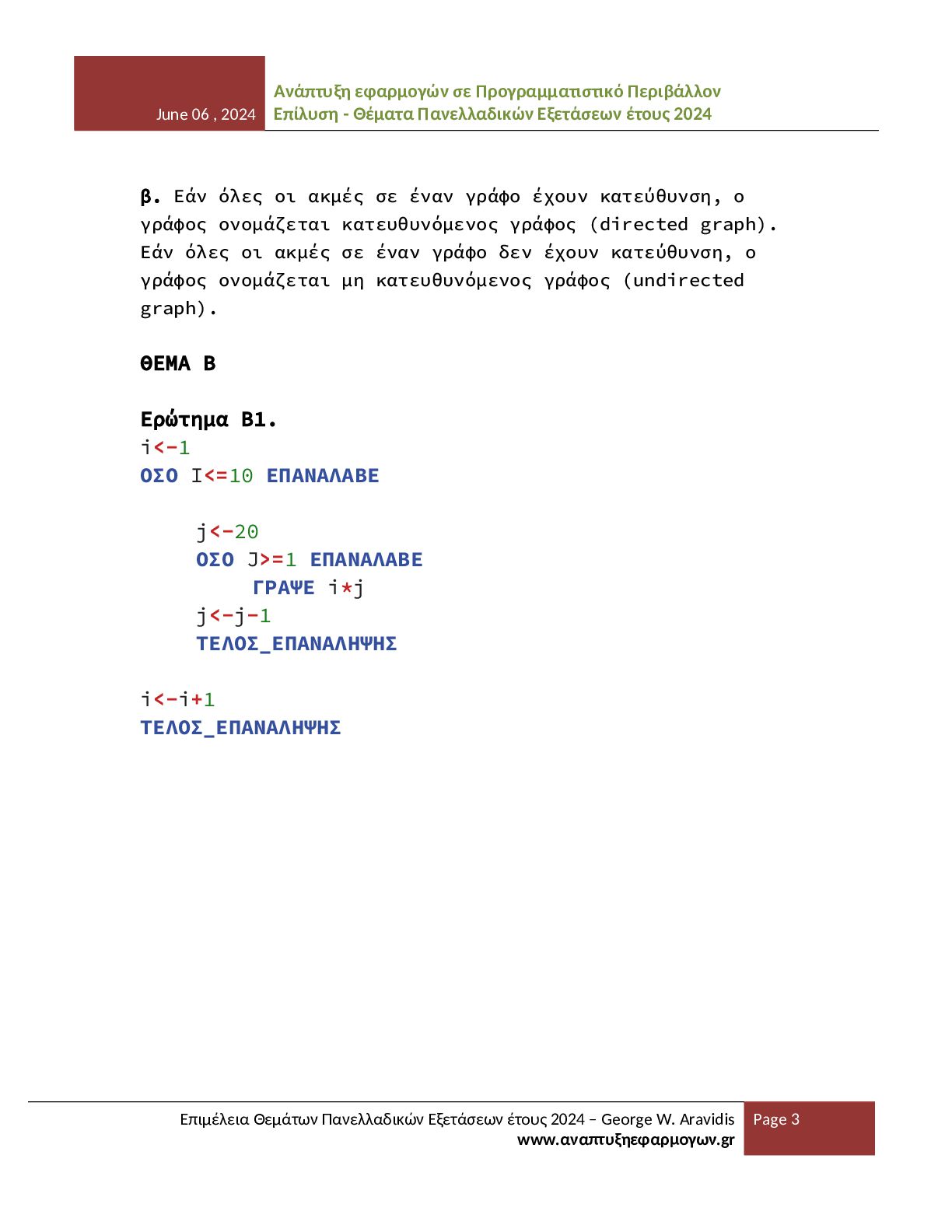 - Θέματα Πανελλαδικών Εξετάσεων έτους 2024 Επιμέλεια Θεμάτων Πανελλαδικών Εξετάσεων έτους 2024 – George W. Aravidis www.αναπτυξηεφαρμογων.gr Page 3 β. Εάν όλες οι ακμές σε έναν γράφο έχουν κατεύθυνση, ο γράφος ονομάζεται κατευθυνόμενος γράφος (directed graph). Εάν όλες οι ακμές σε έναν γράφο δεν έχουν κατεύθυνση, ο γράφος ονομάζεται μη κατευθυνόμενος γράφος (undirected graph). ΘΕΜΑ Β Ερώτημα Β1. i<-1 ΟΣΟ Ι<=10 ΕΠΑΝΑΛΑΒΕ j<-20 ΟΣΟ J>=1 ΕΠΑΝΑΛΑΒΕ ΓΡΑΨΕ i*j j<-j-1 ΤΕΛΟΣ_ΕΠΑΝΑΛΗΨΗΣ i<-i+1 ΤΕΛΟΣ_ΕΠΑΝΑΛΗΨΗΣ