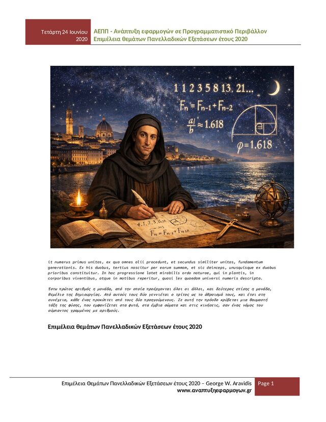 Περιβάλλον Επιμέλεια θεμάτων Πανελλαδικών Εξετάσεων έτους 2020 Επιμέλεια Θεμάτων Πανελλαδικών Εξετάσεων έτους 2020 – George W. Aravidis www.αναπτυξηεφαρμογων.gr Page 1 it numerus primus unitas, ex qua omnes alii procedunt, et secundus similiter unitas, fundamentum generationis. Ex his duobus, tertius nascitur per eorum summam, et sic deinceps, unusquisque ex duobus prioribus constituitur. In hac progressione latet mirabilis ordo naturae, qui in plantis, in corporibus viventibus, atque in motibus reperitur, quasi lex quaedam universi numeris descripta. π , π π π , π , Έστω ρώτος αριθμός η μονάδα α ό την ο οία ροέρχονται όλοι οι άλλοι και δεύτερος ε ίσης η μονάδα . π , θεμέλιο της δημιουργίας Α ό αυτούς τους δύο γεννιέται ο τρίτος ως το άθροισμά τους και έτσι στη , π π π π . π συνέχεια κάθε ένας ροκύ τει α ό τους δύο ροηγούμενους Σε αυτή την ρόοδο κρύβεται μια θαυμαστή , π , , τάξη της φύσης ου εμφανίζεται στα φυτά στα έμβια σώματα και στις κινήσεις σαν ένας νόμος του π . σύμ αντος γραμμένος με αριθμούς Επιμέλεια θεμάτων Πανελλαδικών Εξετάσεων έτους 2020