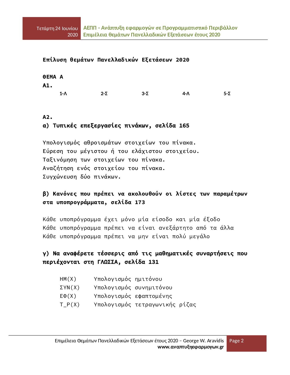 Περιβάλλον Επιμέλεια θεμάτων Πανελλαδικών Εξετάσεων έτους 2020 Επιμέλεια Θεμάτων Πανελλαδικών Εξετάσεων έτους 2020 – George W. Aravidis www.αναπτυξηεφαρμογων.gr Page 2 Επίλυση θεμάτων Πανελλαδικών Εξετάσεων 2020 ΘΕΜΑ Α Α1. 1-Λ 2-Σ 3-Σ 4-Λ 5-Σ Α2. α) Τυπικές επεξεργασίες πινάκων, σελίδα 165 Υπολογισμός αθροισμάτων στοιχείων του πίνακα. Εύρεση του μέγιστου ή του ελάχιστου στοιχείου. Ταξινόμηση των στοιχείων του πίνακα. Αναζήτηση ενός στοιχείου του πίνακα. Συγχώνευση δύο πινάκων. β) Κανόνες που πρέπει να ακολουθούν οι λίστες των παραμέτρων στα υποπρογράμματα, σελίδα 173 Κάθε υποπρόγραμμα έχει μόνο μία είσοδο και μία έξοδο Κάθε υποπρόγραμμα πρέπει να είναι ανεξάρτητο από τα άλλα Κάθε υποπρόγραμμα πρέπει να μην είναι πολύ μεγάλο γ) Να αναφέρετε τέσσερις από τις μαθηματικές συναρτήσεις που περιέχονται στη ΓΛΩΣΣΑ, σελίδα 131 ΗΜ(Χ) Υπολογισμός ημιτόνου ΣΥΝ(Χ) Υπολογισμός συνημιτόνου ΕΦ(Χ) Υπολογισμός εφαπτομένης Τ_Ρ(Χ) Υπολογισμός τετραγωνικής ρίζας