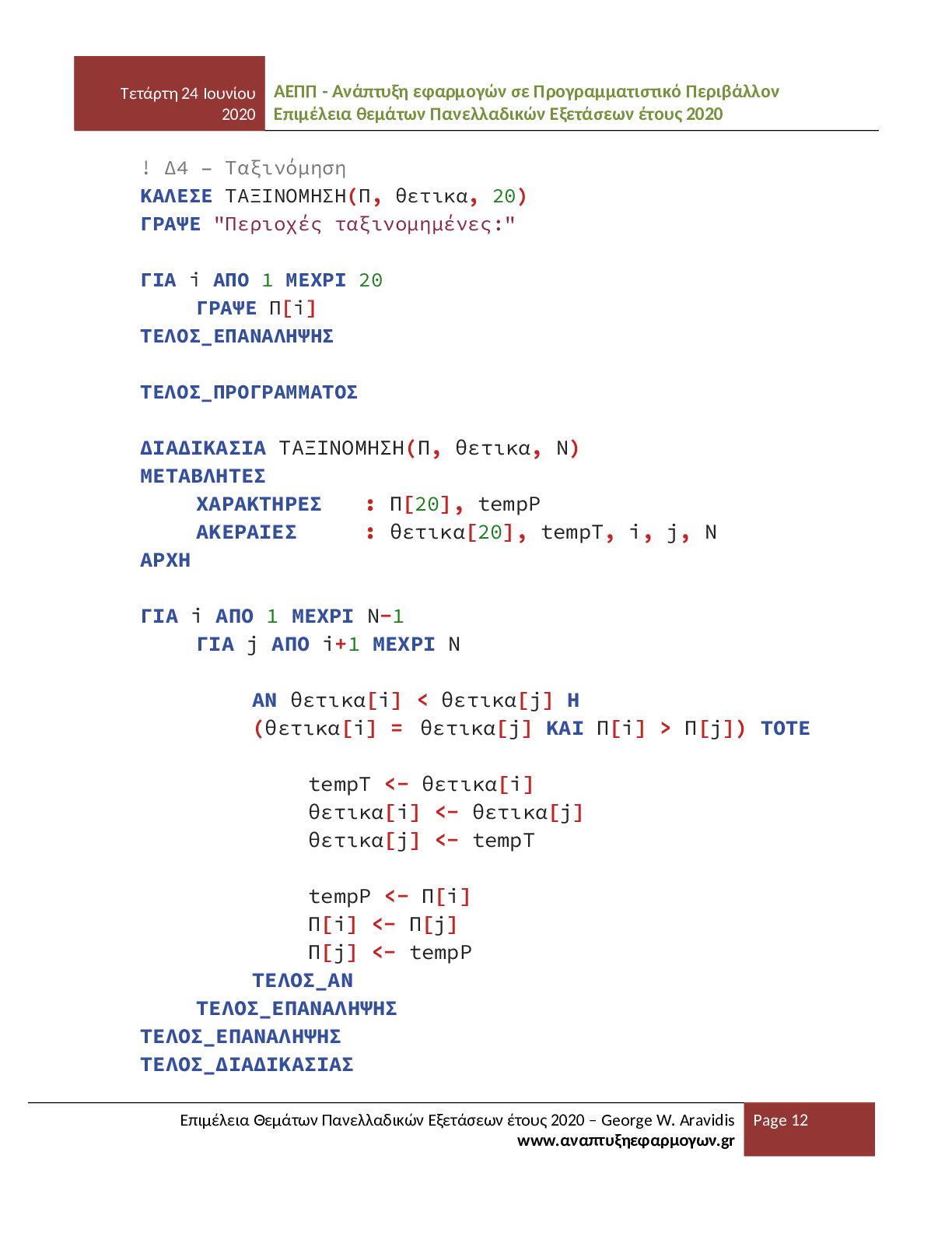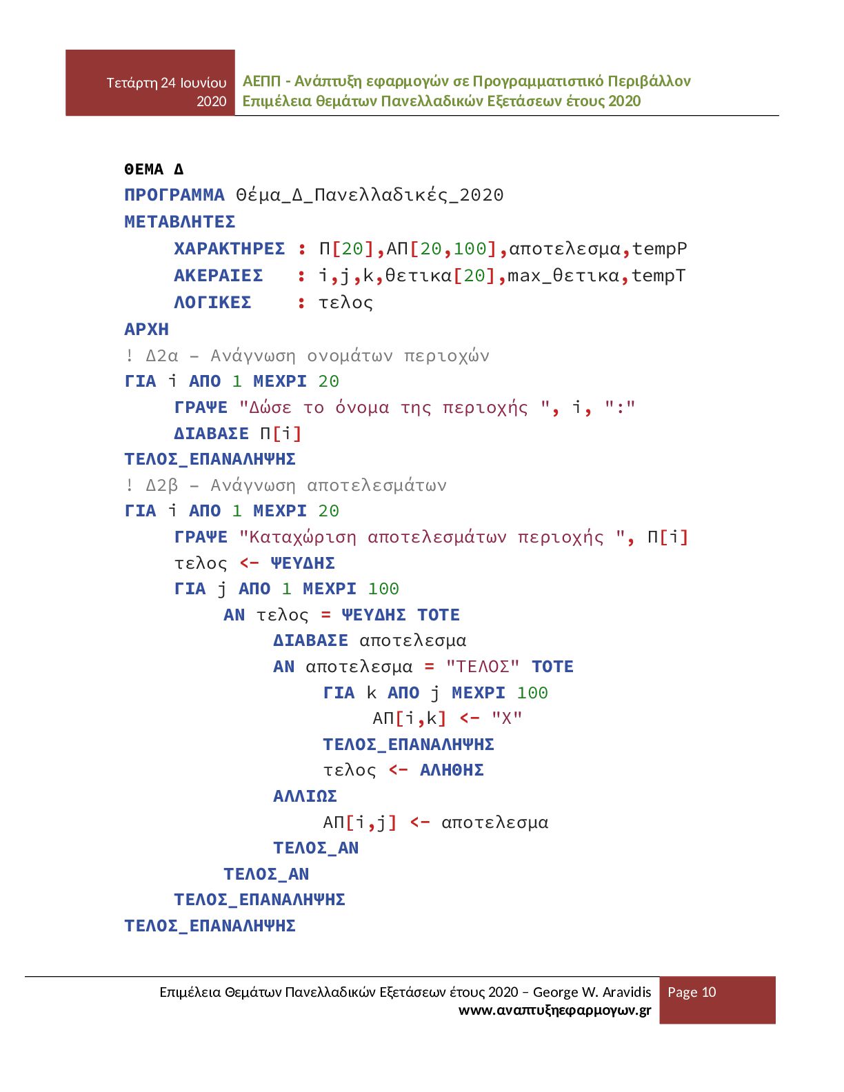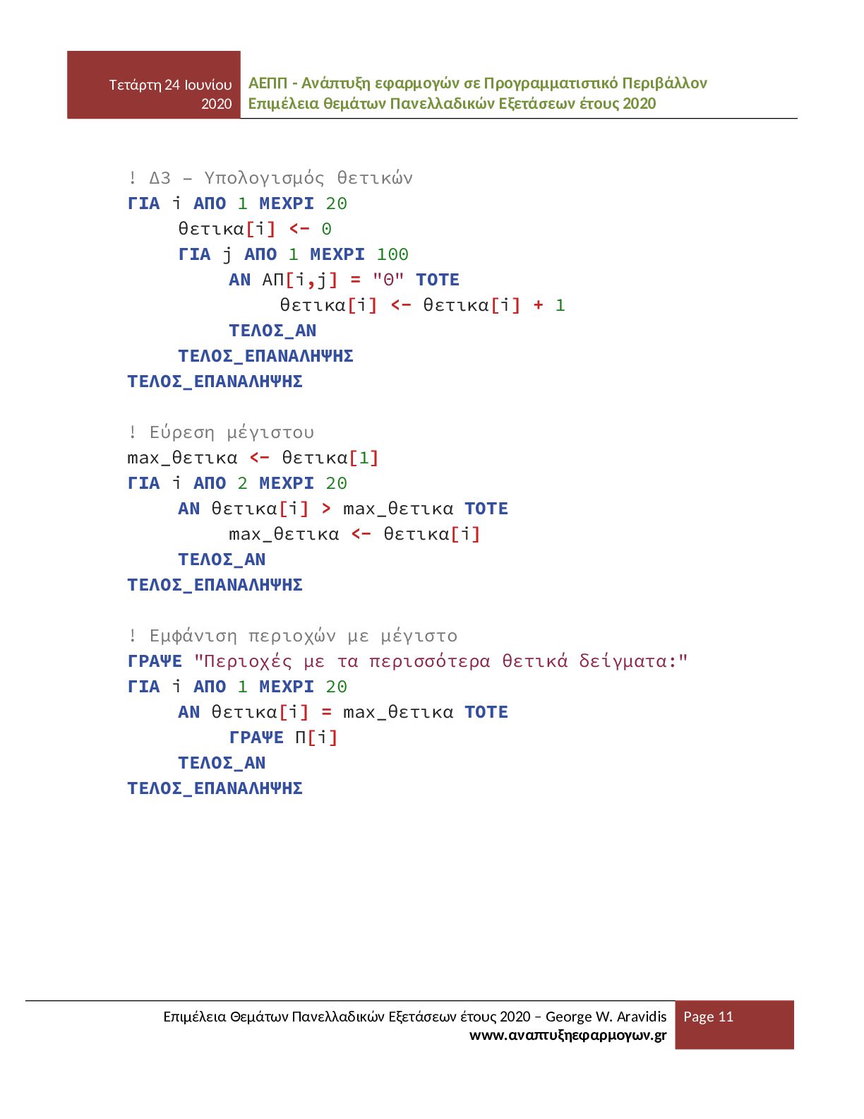 Περιβάλλον Επιμέλεια θεμάτων Πανελλαδικών Εξετάσεων έτους 2020 Επιμέλεια Θεμάτων Πανελλαδικών Εξετάσεων έτους 2020 – George W. Aravidis www.αναπτυξηεφαρμογων.gr Page 11 ! Δ3 – Υπολογισμός θετικών ΓΙΑ i ΑΠΟ 1 ΜΕΧΡΙ 20 θετικα[i] <- 0 ΓΙΑ j ΑΠΟ 1 ΜΕΧΡΙ 100 ΑΝ ΑΠ[i,j] = "Θ" ΤΟΤΕ θετικα[i] <- θετικα[i] + 1 ΤΕΛΟΣ_ΑΝ ΤΕΛΟΣ_ΕΠΑΝΑΛΗΨΗΣ ΤΕΛΟΣ_ΕΠΑΝΑΛΗΨΗΣ ! Εύρεση μέγιστου max_θετικα <- θετικα[1] ΓΙΑ i ΑΠΟ 2 ΜΕΧΡΙ 20 ΑΝ θετικα[i] > max_θετικα ΤΟΤΕ max_θετικα <- θετικα[i] ΤΕΛΟΣ_ΑΝ ΤΕΛΟΣ_ΕΠΑΝΑΛΗΨΗΣ ! Εμφάνιση περιοχών με μέγιστο ΓΡΑΨΕ "Περιοχές με τα περισσότερα θετικά δείγματα:" ΓΙΑ i ΑΠΟ 1 ΜΕΧΡΙ 20 ΑΝ θετικα[i] = max_θετικα ΤΟΤΕ ΓΡΑΨΕ Π[i] ΤΕΛΟΣ_ΑΝ ΤΕΛΟΣ_ΕΠΑΝΑΛΗΨΗΣ