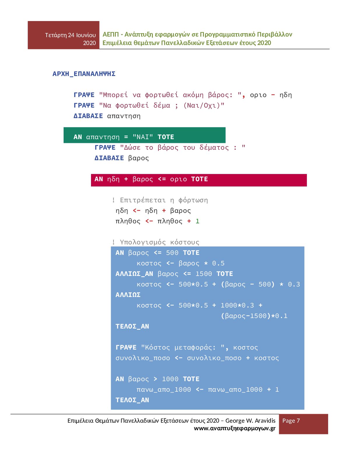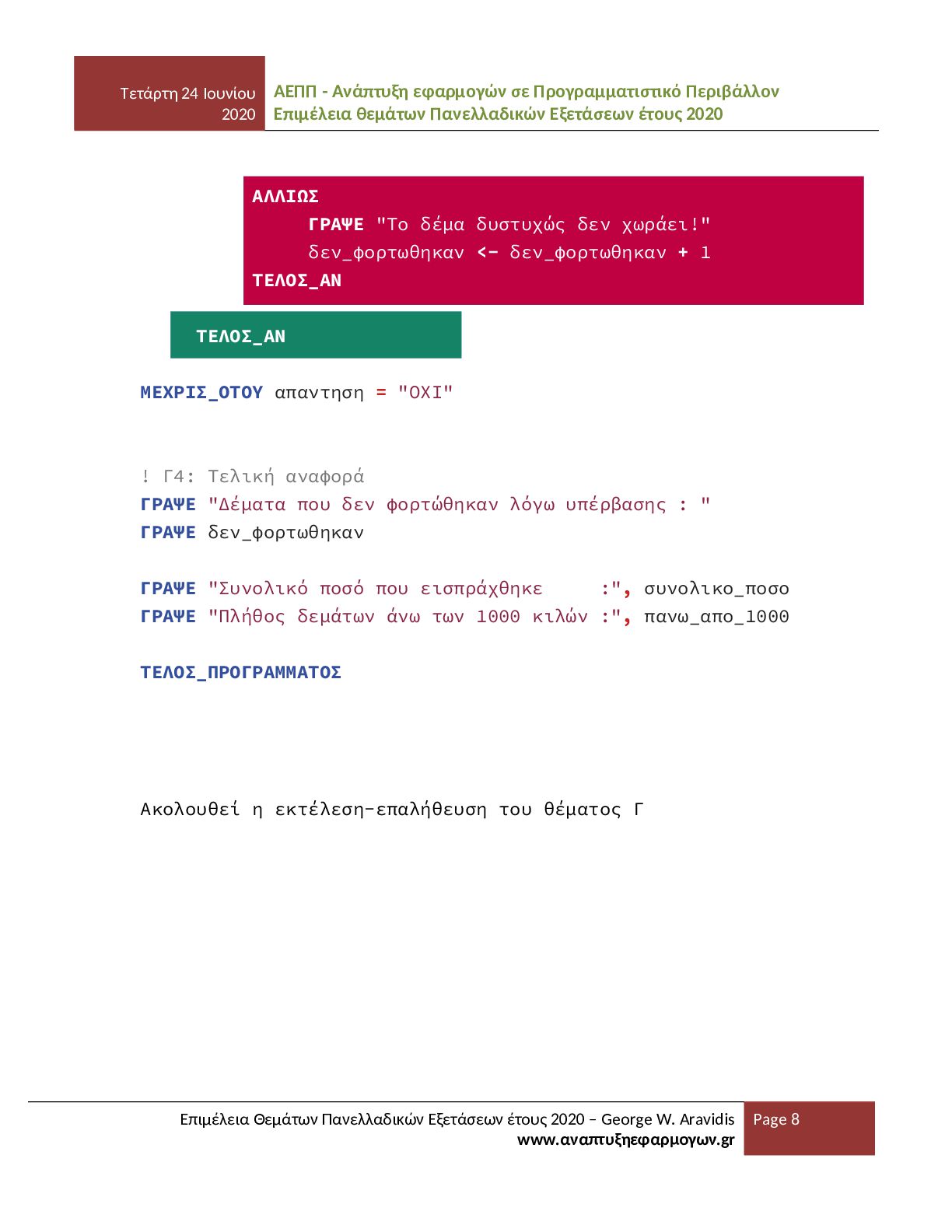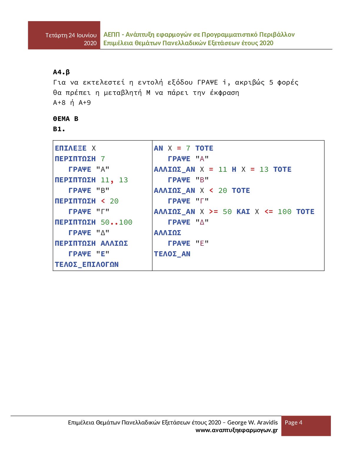 Περιβάλλον Επιμέλεια θεμάτων Πανελλαδικών Εξετάσεων έτους 2020 Επιμέλεια Θεμάτων Πανελλαδικών Εξετάσεων έτους 2020 – George W. Aravidis www.αναπτυξηεφαρμογων.gr Page 11 ! Δ3 – Υπολογισμός θετικών ΓΙΑ i ΑΠΟ 1 ΜΕΧΡΙ 20 θετικα[i] <- 0 ΓΙΑ j ΑΠΟ 1 ΜΕΧΡΙ 100 ΑΝ ΑΠ[i,j] = "Θ" ΤΟΤΕ θετικα[i] <- θετικα[i] + 1 ΤΕΛΟΣ_ΑΝ ΤΕΛΟΣ_ΕΠΑΝΑΛΗΨΗΣ ΤΕΛΟΣ_ΕΠΑΝΑΛΗΨΗΣ ! Εύρεση μέγιστου max_θετικα <- θετικα[1] ΓΙΑ i ΑΠΟ 2 ΜΕΧΡΙ 20 ΑΝ θετικα[i] > max_θετικα ΤΟΤΕ max_θετικα <- θετικα[i] ΤΕΛΟΣ_ΑΝ ΤΕΛΟΣ_ΕΠΑΝΑΛΗΨΗΣ ! Εμφάνιση περιοχών με μέγιστο ΓΡΑΨΕ "Περιοχές με τα περισσότερα θετικά δείγματα:" ΓΙΑ i ΑΠΟ 1 ΜΕΧΡΙ 20 ΑΝ θετικα[i] = max_θετικα ΤΟΤΕ ΓΡΑΨΕ Π[i] ΤΕΛΟΣ_ΑΝ ΤΕΛΟΣ_ΕΠΑΝΑΛΗΨΗΣ