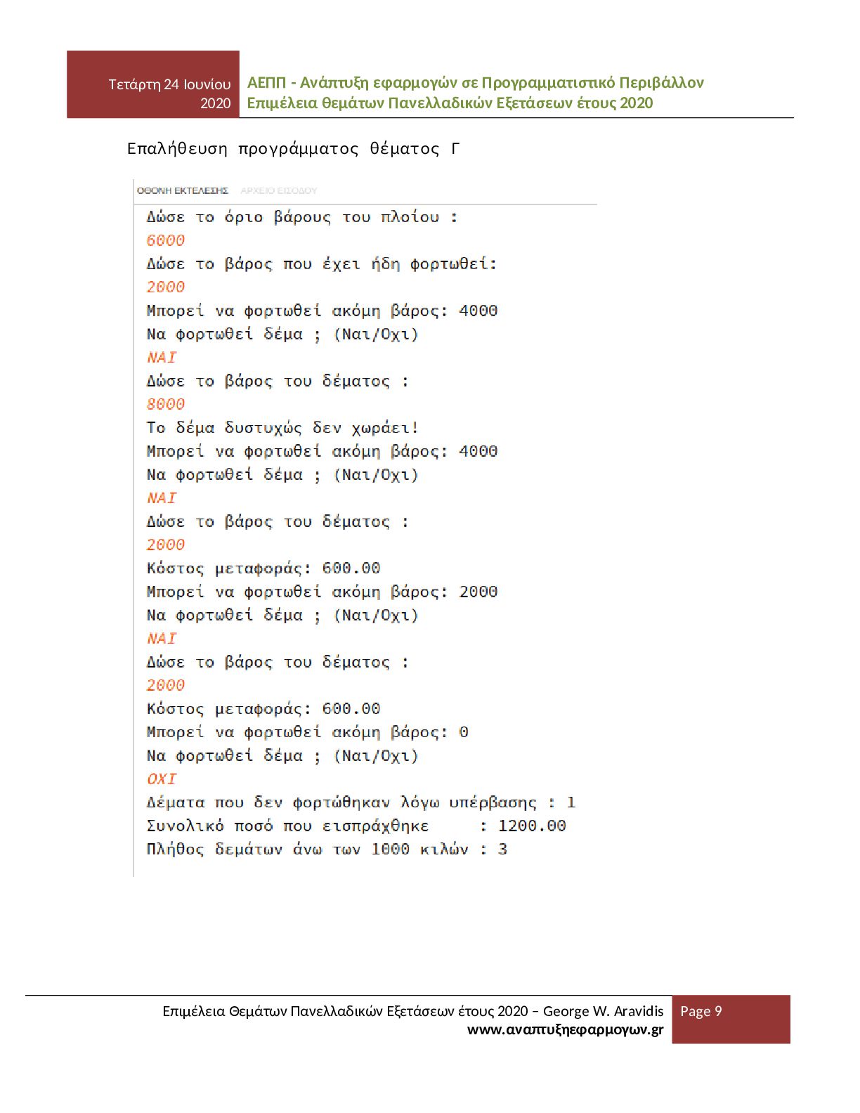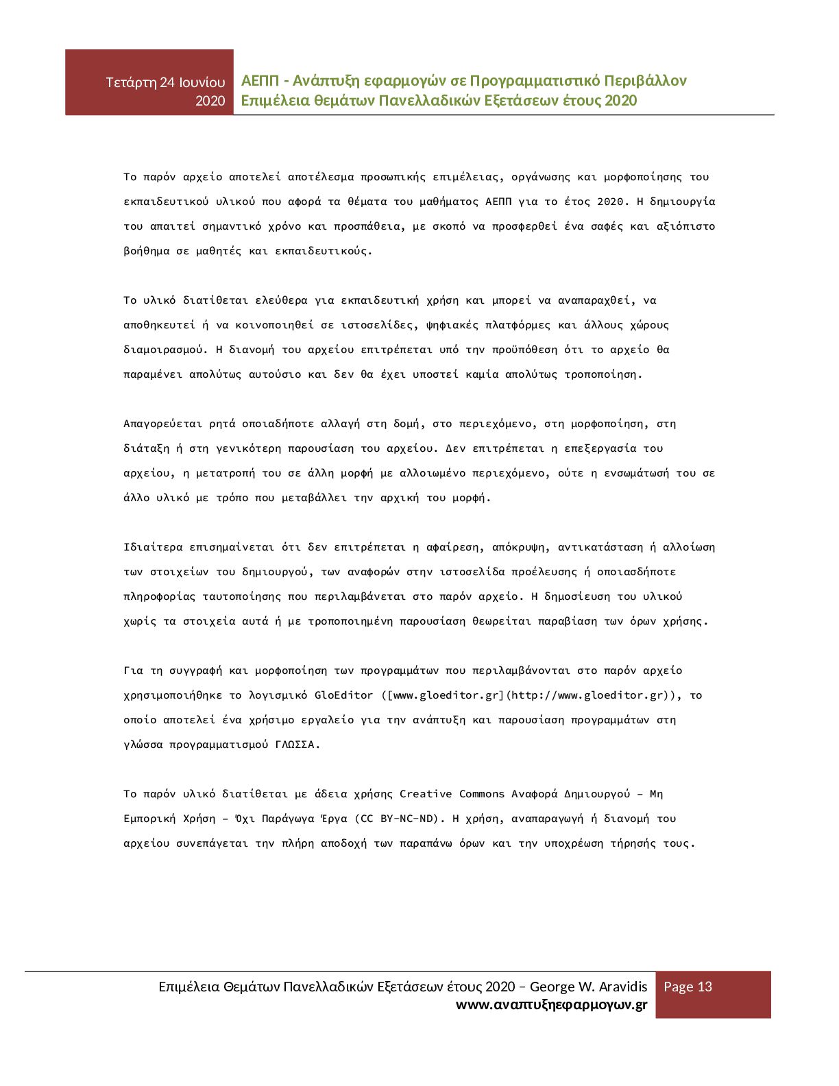 Περιβάλλον Επιμέλεια θεμάτων Πανελλαδικών Εξετάσεων έτους 2020 Επιμέλεια Θεμάτων Πανελλαδικών Εξετάσεων έτους 2020 – George W. Aravidis www.αναπτυξηεφαρμογων.gr Page 13 Το παρόν αρχείο αποτελεί αποτέλεσμα προσωπικής επιμέλειας, οργάνωσης και μορφοποίησης του εκπαιδευτικού υλικού που αφορά τα θέματα του μαθήματος ΑΕΠΠ για το έτος 2020. Η δημιουργία του απαιτεί σημαντικό χρόνο και προσπάθεια, με σκοπό να προσφερθεί ένα σαφές και αξιόπιστο βοήθημα σε μαθητές και εκπαιδευτικούς. Το υλικό διατίθεται ελεύθερα για εκπαιδευτική χρήση και μπορεί να αναπαραχθεί, να αποθηκευτεί ή να κοινοποιηθεί σε ιστοσελίδες, ψηφιακές πλατφόρμες και άλλους χώρους διαμοιρασμού. Η διανομή του αρχείου επιτρέπεται υπό την προϋπόθεση ότι το αρχείο θα παραμένει απολύτως αυτούσιο και δεν θα έχει υποστεί καμία απολύτως τροποποίηση. Απαγορεύεται ρητά οποιαδήποτε αλλαγή στη δομή, στο περιεχόμενο, στη μορφοποίηση, στη διάταξη ή στη γενικότερη παρουσίαση του αρχείου. Δεν επιτρέπεται η επεξεργασία του αρχείου, η μετατροπή του σε άλλη μορφή με αλλοιωμένο περιεχόμενο, ούτε η ενσωμάτωσή του σε άλλο υλικό με τρόπο που μεταβάλλει την αρχική του μορφή. Ιδιαίτερα επισημαίνεται ότι δεν επιτρέπεται η αφαίρεση, απόκρυψη, αντικατάσταση ή αλλοίωση των στοιχείων του δημιουργού, των αναφορών στην ιστοσελίδα προέλευσης ή οποιασδήποτε πληροφορίας ταυτοποίησης που περιλαμβάνεται στο παρόν αρχείο. Η δημοσίευση του υλικού χωρίς τα στοιχεία αυτά ή με τροποποιημένη παρουσίαση θεωρείται παραβίαση των όρων χρήσης. Για τη συγγραφή και μορφοποίηση των προγραμμάτων που περιλαμβάνονται στο παρόν αρχείο χρησιμοποιήθηκε το λογισμικό GloEditor ([www.gloeditor.gr](http://www.gloeditor.gr)), το οποίο αποτελεί ένα χρήσιμο εργαλείο για την ανάπτυξη και παρουσίαση προγραμμάτων στη γλώσσα προγραμματισμού ΓΛΩΣΣΑ. Το παρόν υλικό διατίθεται με άδεια χρήσης Creative Commons Αναφορά Δημιουργού – Μη Εμπορική Χρήση – Όχι Παράγωγα Έργα (CC BY-NC-ND). Η χρήση, αναπαραγωγή ή διανομή του αρχείου συνεπάγεται την πλήρη αποδοχή των παραπάνω όρων και την υποχρέωση τήρησής τους.