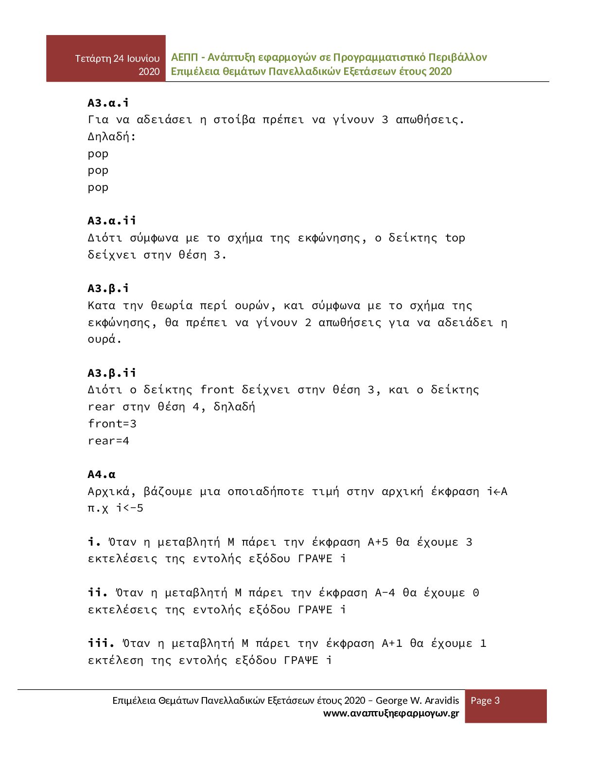 Περιβάλλον Επιμέλεια θεμάτων Πανελλαδικών Εξετάσεων έτους 2020 Επιμέλεια Θεμάτων Πανελλαδικών Εξετάσεων έτους 2020 – George W. Aravidis www.αναπτυξηεφαρμογων.gr Page 3 A3.α.i Για να αδειάσει η στοίβα πρέπει να γίνουν 3 απωθήσεις. Δηλαδή: pop pop pop A3.α.ii Διότι σύμφωνα με το σχήμα της εκφώνησης, ο δείκτης top δείχνει στην θέση 3. A3.β.i Κατα την θεωρία περί ουρών, και σύμφωνα με το σχήμα της εκφώνησης, θα πρέπει να γίνουν 2 απωθήσεις για να αδειάδει η ουρά. A3.β.ii Διότι ο δείκτης front δείχνει στην θέση 3, και ο δείκτης rear στην θέση 4, δηλαδή front=3 rear=4 Α4.α Αρχικά, βάζουμε μια οποιαδήποτε τιμή στην αρχική έκφραση i←A π.χ i<-5 i. Όταν η μεταβλητή Μ πάρει την έκφραση Α+5 θα έχουμε 3 εκτελέσεις της εντολής εξόδου ΓΡΑΨΕ i ii. Όταν η μεταβλητή Μ πάρει την έκφραση Α-4 θα έχουμε 0 εκτελέσεις της εντολής εξόδου ΓΡΑΨΕ i iii. Όταν η μεταβλητή Μ πάρει την έκφραση Α+1 θα έχουμε 1 εκτέλεση της εντολής εξόδου ΓΡΑΨΕ i