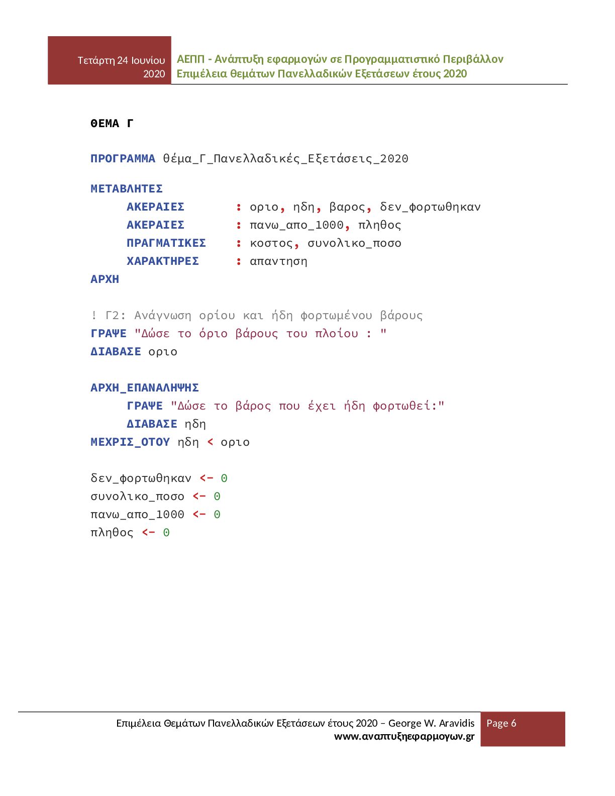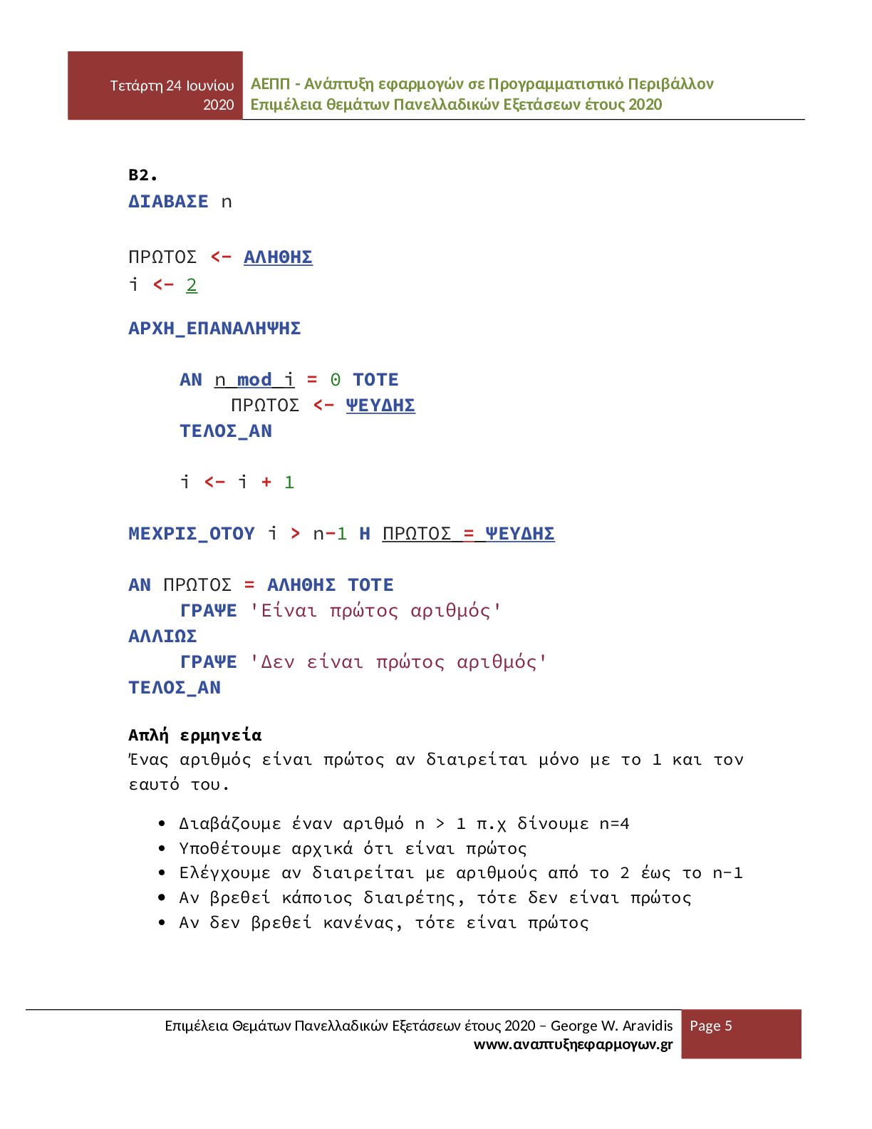 Περιβάλλον Επιμέλεια θεμάτων Πανελλαδικών Εξετάσεων έτους 2020 Επιμέλεια Θεμάτων Πανελλαδικών Εξετάσεων έτους 2020 – George W. Aravidis www.αναπτυξηεφαρμογων.gr Page 5 Β2. ΔΙΑΒΑΣΕ n ΠΡΩΤΟΣ <- ΑΛΗΘΗΣ i <- 2 ΑΡΧΗ_ΕΠΑΝΑΛΗΨΗΣ ΑΝ n mod i = 0 ΤΟΤΕ ΠΡΩΤΟΣ <- ΨΕΥΔΗΣ ΤΕΛΟΣ_ΑΝ i <- i + 1 ΜΕΧΡΙΣ_ΟΤΟΥ i > n-1 Η ΠΡΩΤΟΣ = ΨΕΥΔΗΣ ΑΝ ΠΡΩΤΟΣ = ΑΛΗΘΗΣ ΤΟΤΕ ΓΡΑΨΕ 'Είναι πρώτος αριθμός' ΑΛΛΙΩΣ ΓΡΑΨΕ 'Δεν είναι πρώτος αριθμός' ΤΕΛΟΣ_ΑΝ Απλή ερμηνεία Ένας αριθμός είναι πρώτος αν διαιρείται μόνο με το 1 και τον εαυτό του. Διαβάζουμε έναν αριθμό n > 1 π.χ δίνουμε n=4 Υποθέτουμε αρχικά ότι είναι πρώτος Ελέγχουμε αν διαιρείται με αριθμούς από το 2 έως το n−1 Αν βρεθεί κάποιος διαιρέτης, τότε δεν είναι πρώτος Αν δεν βρεθεί κανένας, τότε είναι πρώτος