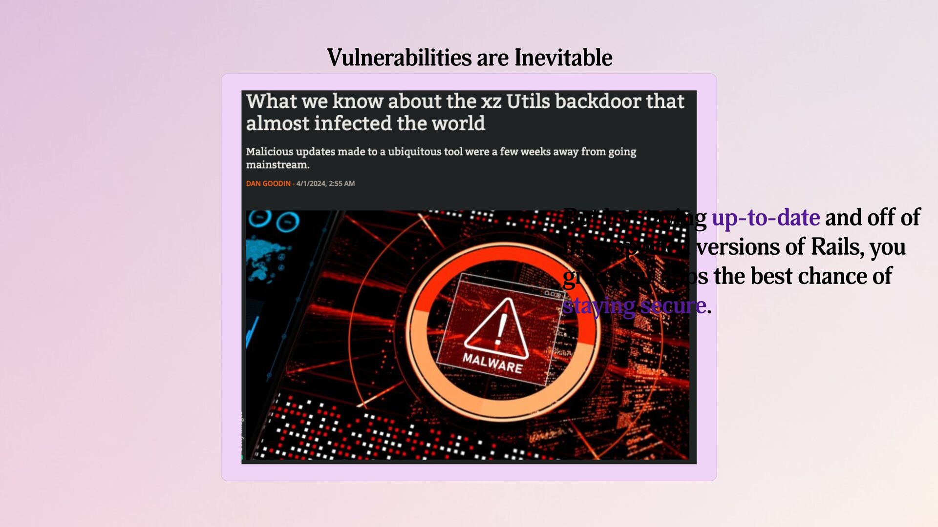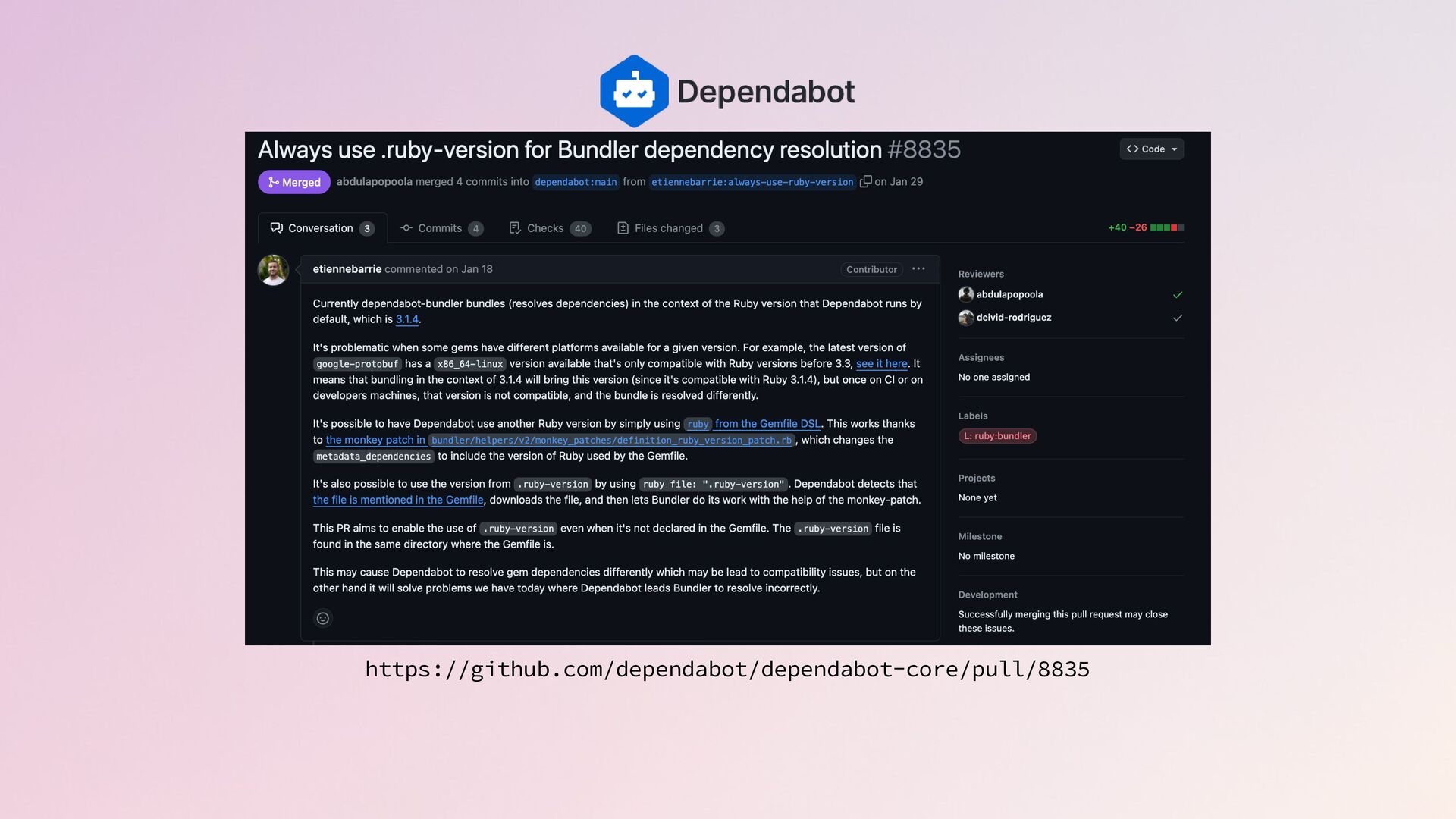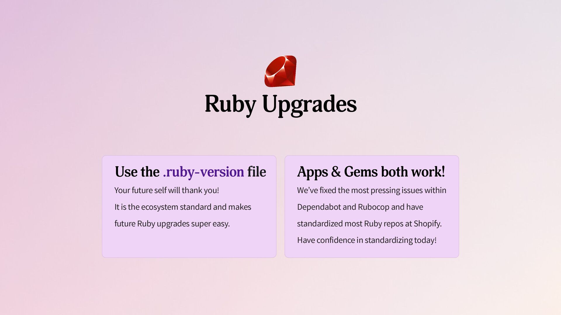 In this talk we will dive into how Shopify automated Rails upgrades as well as leveraged Dependabot, Rubocop, and Bundler to easily upgrade and maintain 300+ Ruby Services at Shopify to be on the latest Ruby & Rails versions. You'll learn how you can do the same!