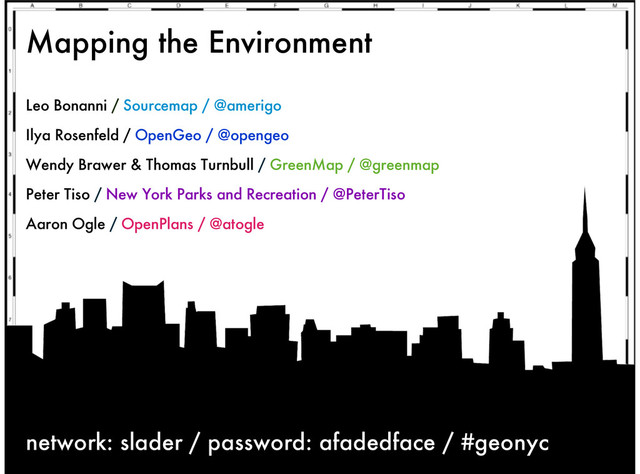 Rosenfeld / OpenGeo / @opengeo Wendy Brawer & Thomas Turnbull / GreenMap / @greenmap Peter Tiso / New York Parks and Recreation / @PeterTiso Aaron Ogle / OpenPlans / @atogle network: slader / password: afadedface / #geonyc