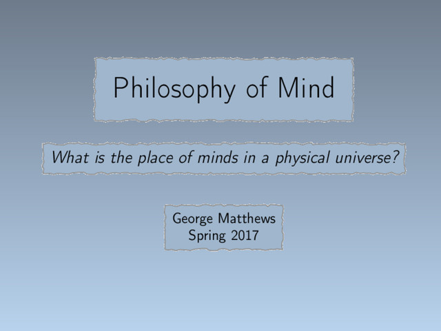 in the physical universe? Minds are real but non-physical things. dualism ! Dualists claim there are two basic kinds of stuff in the world, matter and minds. ! This view of the mind has ancient roots – the concept of a soul as an immaterial entity separate from the body is a version of dualism.