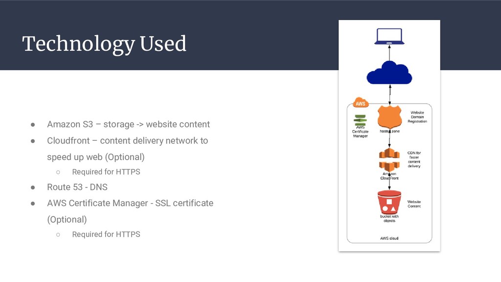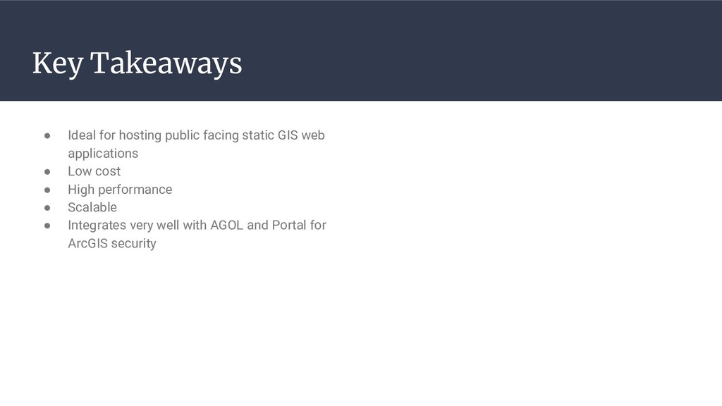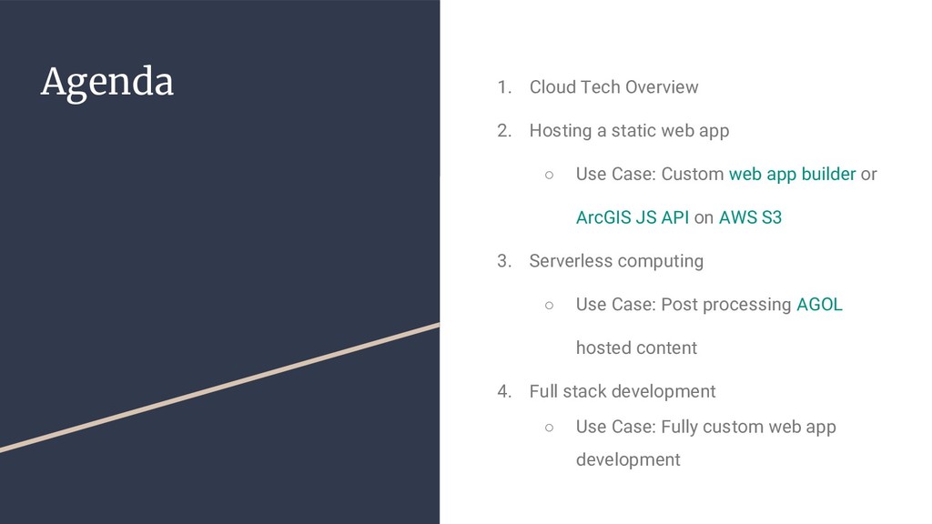 AGOL hosted feature layers, 2) Amazon S3 buckets and CloudFront for hosting web applications customized using the