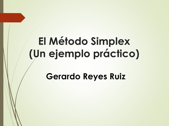En esta presentación se muestra, brevemente, en qué consiste el Método Simplex, el cual se basa en el algoritmo conocido como Gauss-Jordan. También se desarrolla detalladamente un ejercicio para comprender este método de optimización.