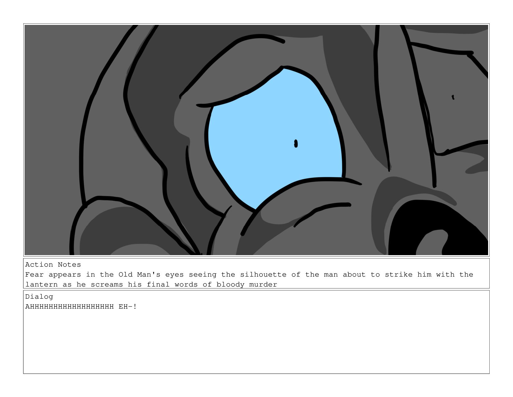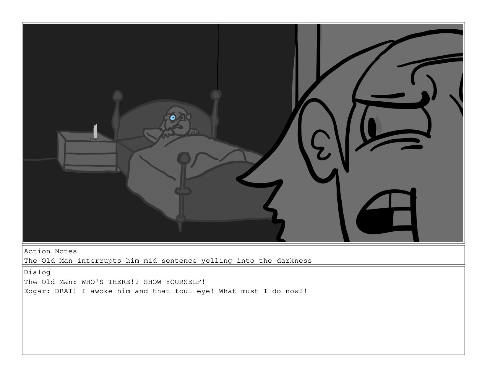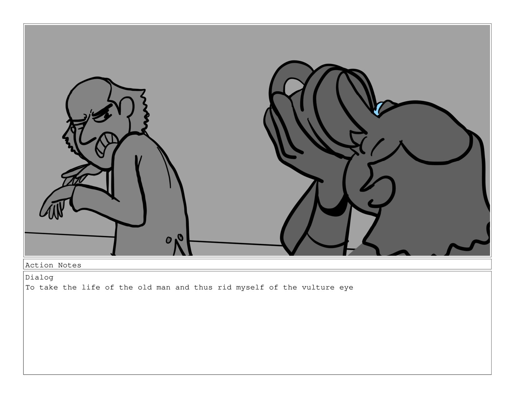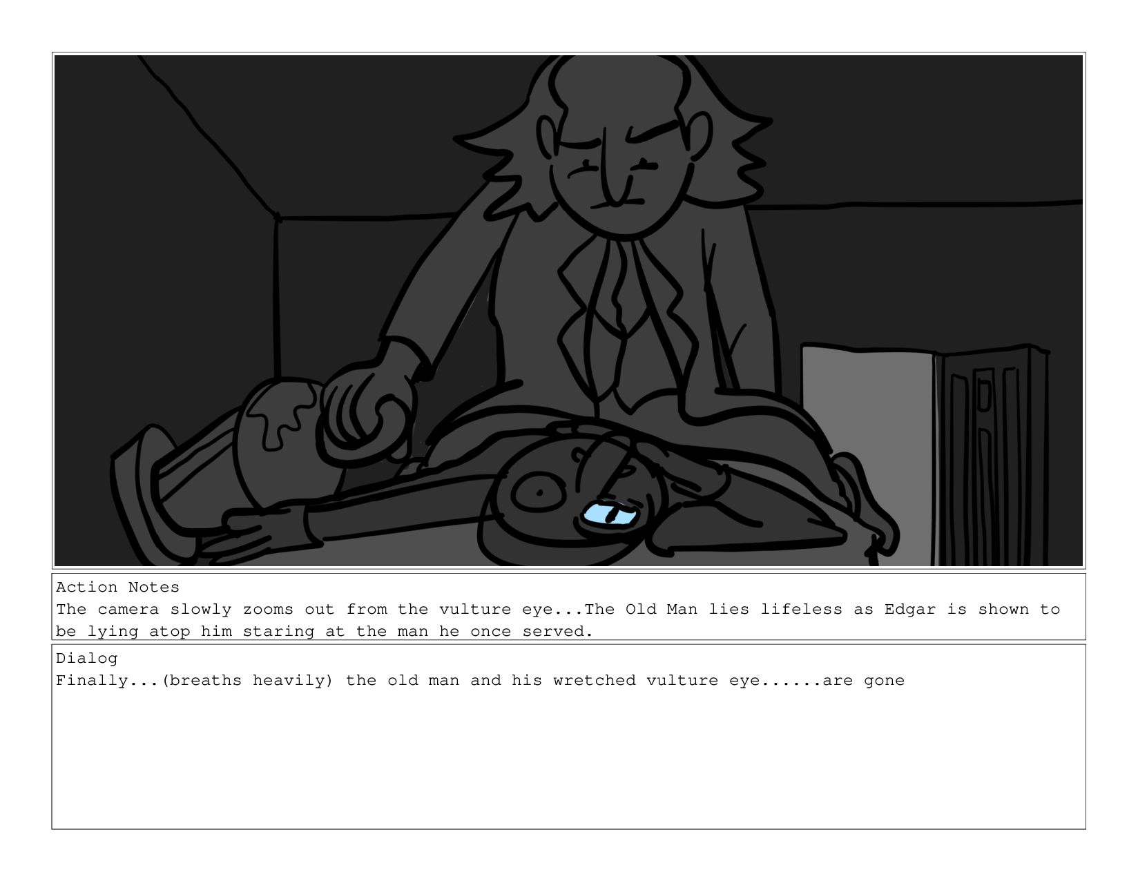 eye...The Old Man lies lifeless as Edgar is shown to be lying atop him staring at the man he once served. Dialog Finally...(breaths heavily) the old man and his wretched vulture eye......are gone