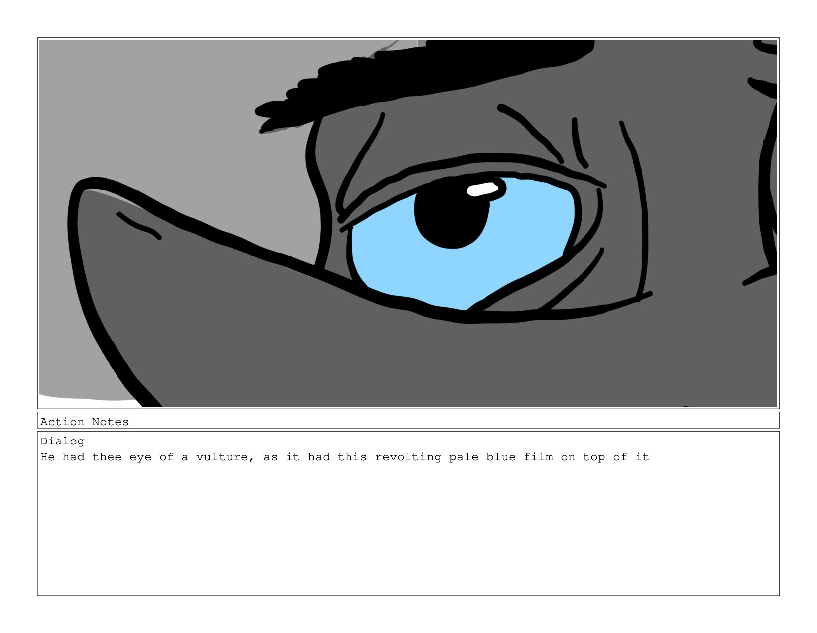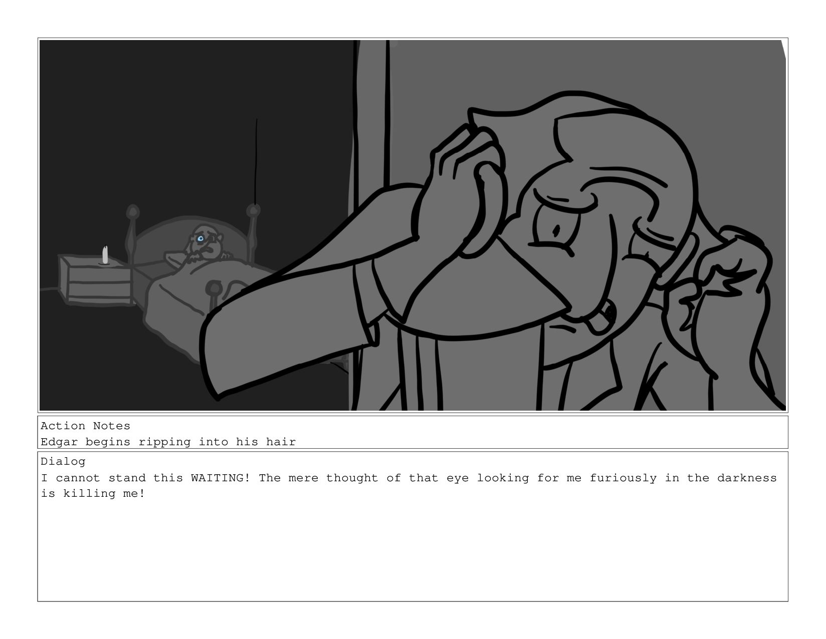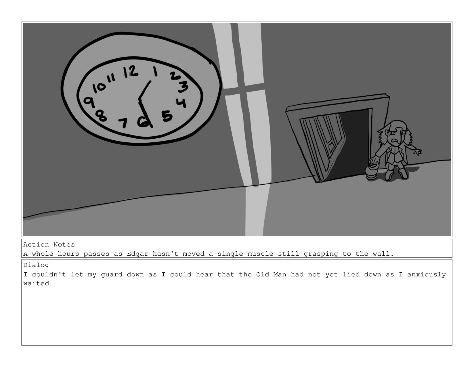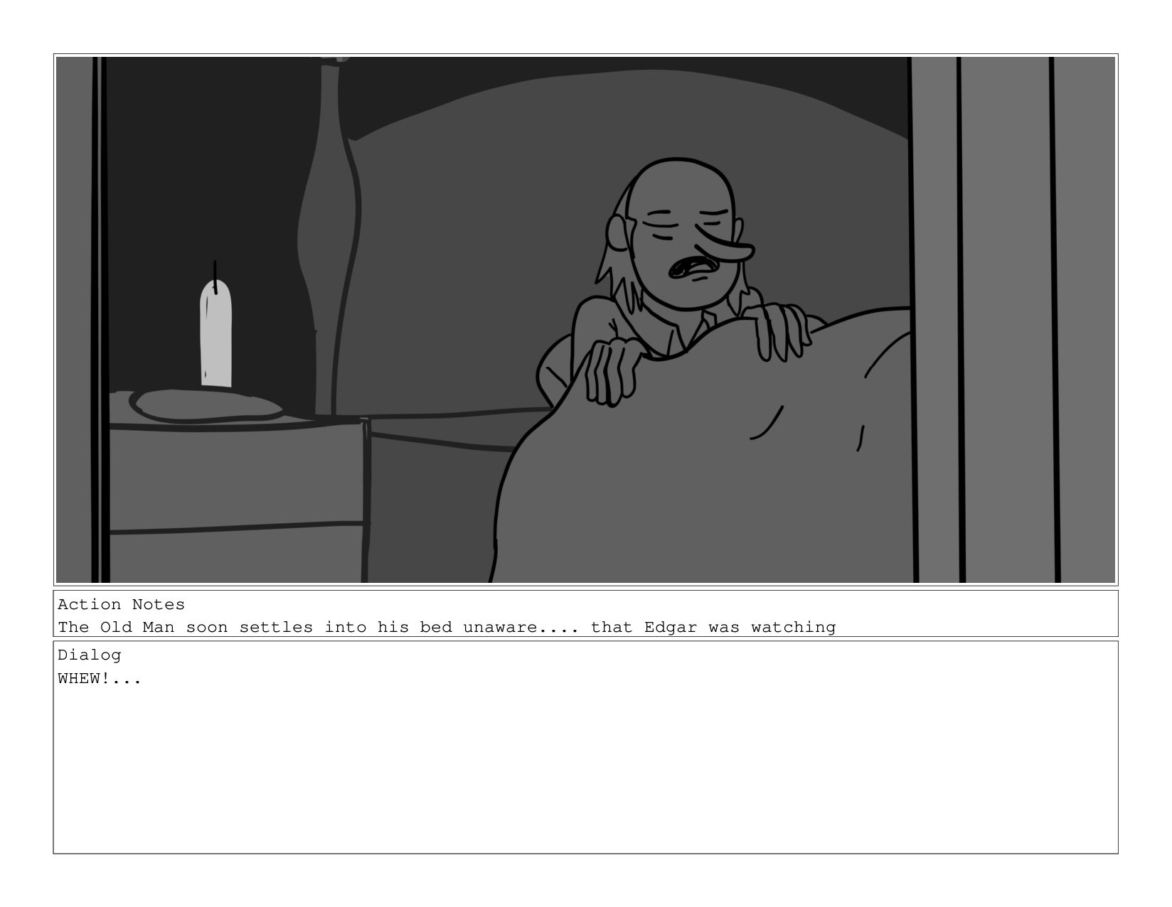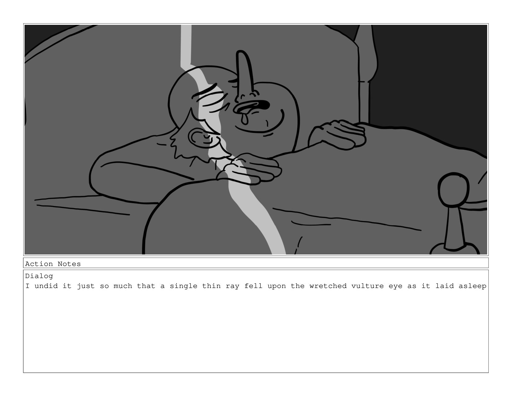 eye...The Old Man lies lifeless as Edgar is shown to be lying atop him staring at the man he once served. Dialog Finally...(breaths heavily) the old man and his wretched vulture eye......are gone