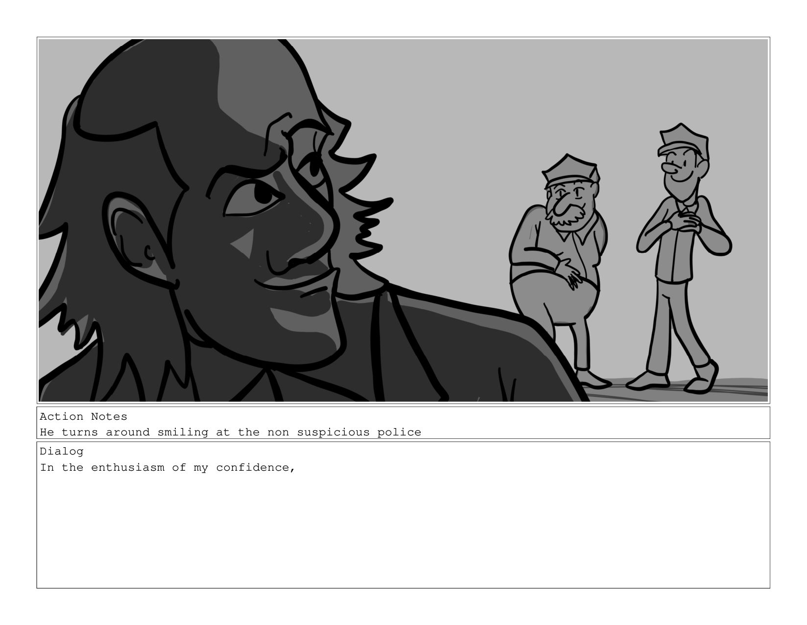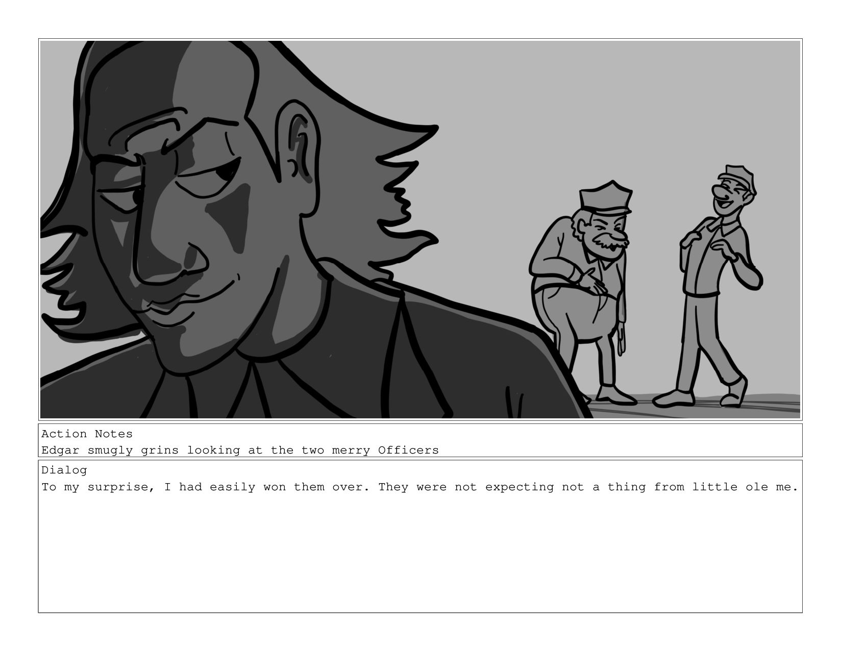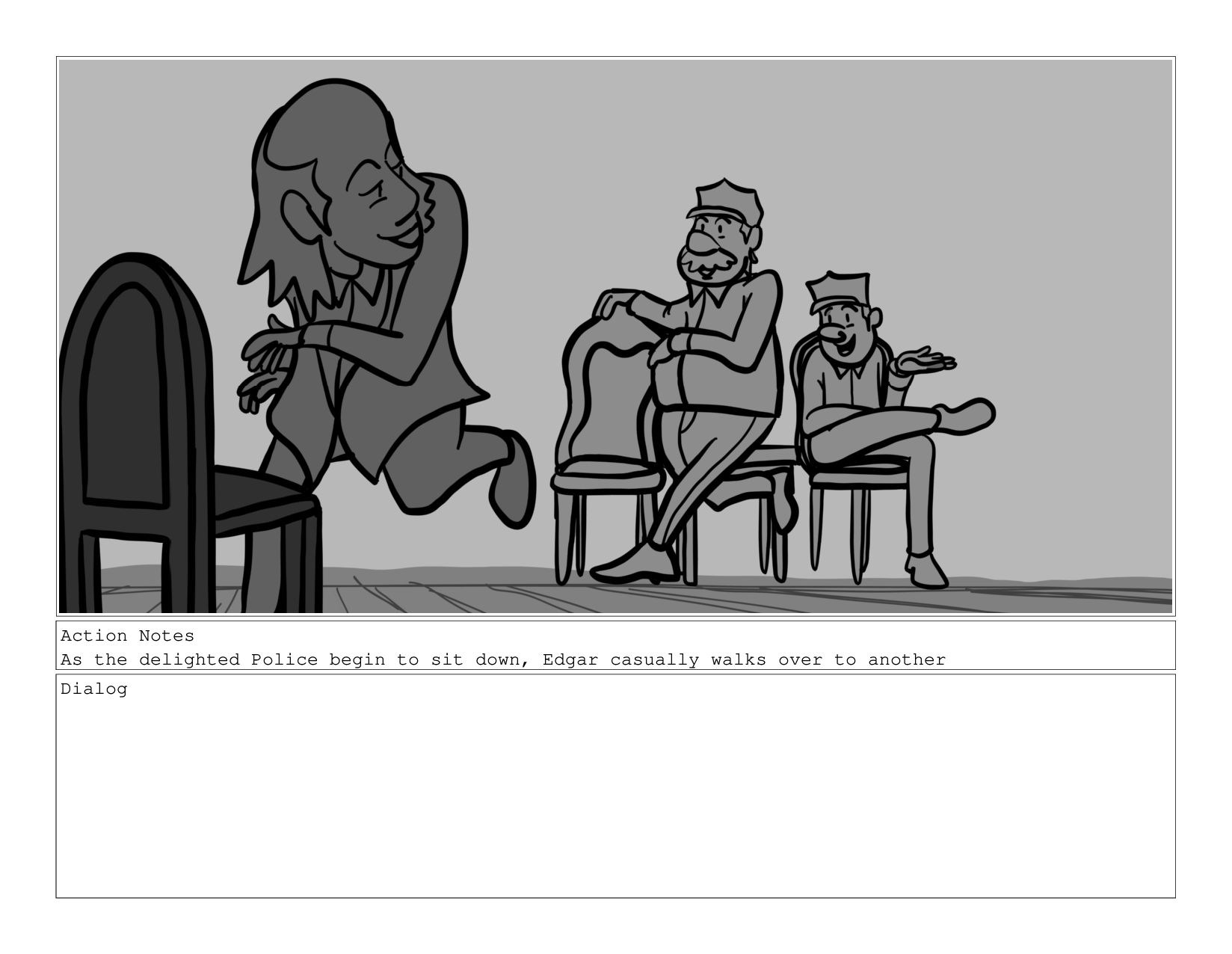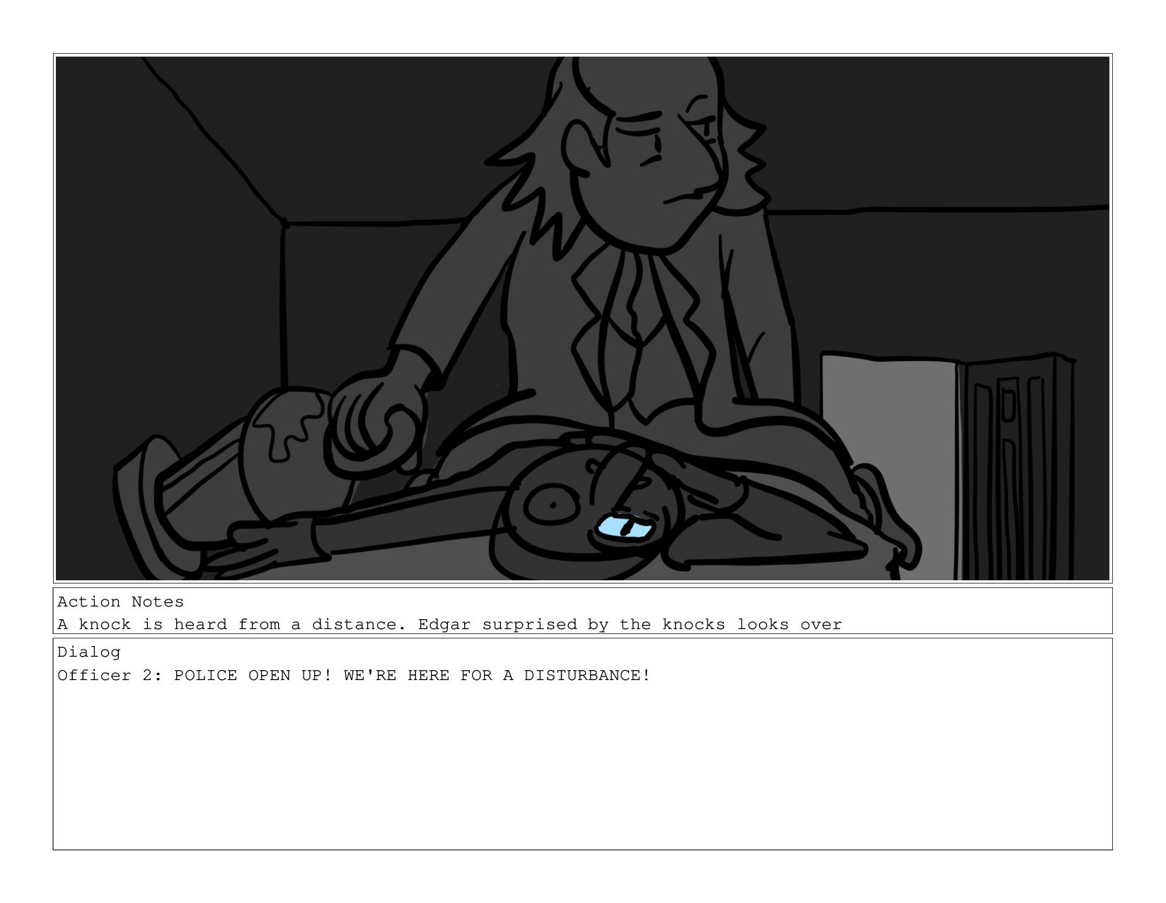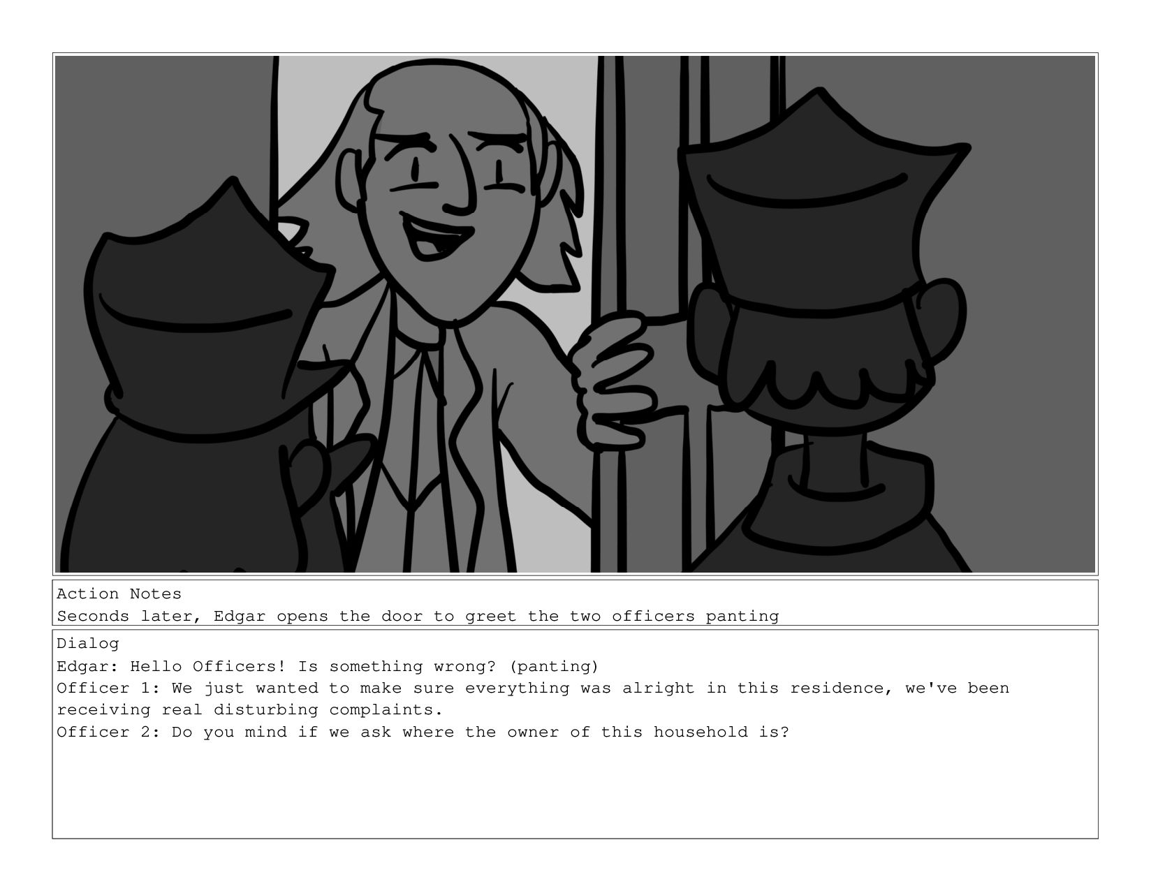 the two officers panting Dialog Edgar: Hello Officers! Is something wrong? (panting) Officer 1: We just wanted to make sure everything was alright in this residence, we've been receiving real disturbing complaints. Officer 2: Do you mind if we ask where the owner of this household is?