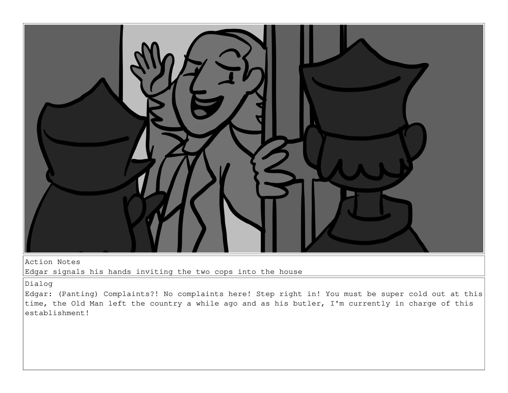 into the house Dialog Edgar: (Panting) Complaints?! No complaints here! Step right in! You must be super cold out at this time, the Old Man left the country a while ago and as his butler, I'm currently in charge of this establishment!