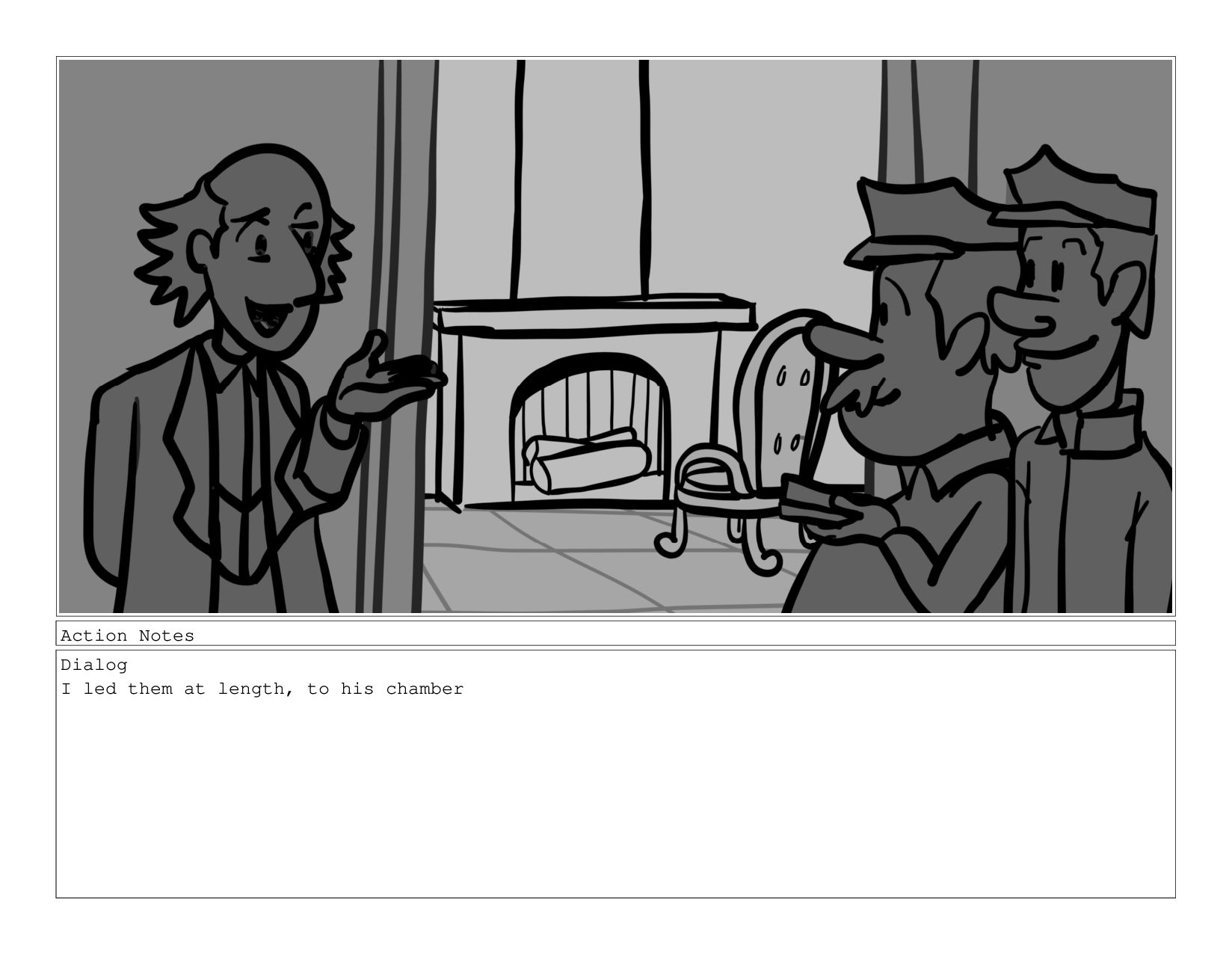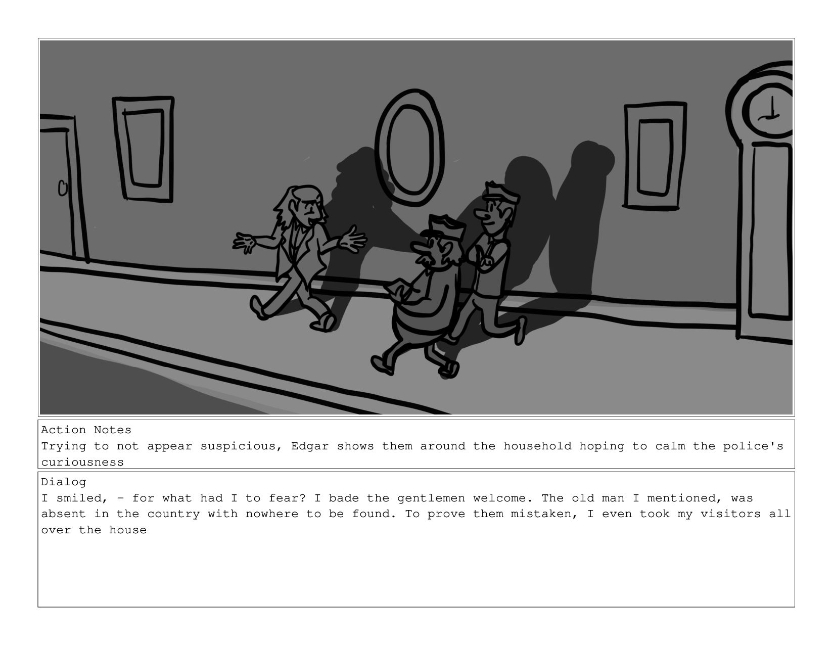around the household hoping to calm the police's curiousness Dialog I smiled, - for what had I to fear? I bade the gentlemen welcome. The old man I mentioned, was absent in the country with nowhere to be found. To prove them mistaken, I even took my visitors all over the house