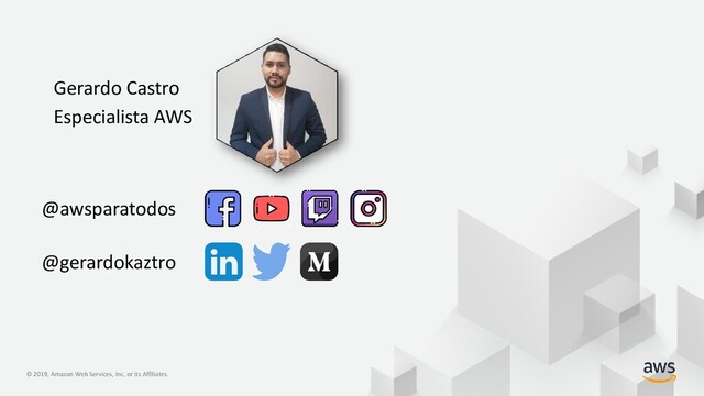 rights reserved. © 2019, Amazon Web Services, Inc. or its Affiliates. Gerardo Castro @awsparatodos @gerardokaztro Especialista AWS