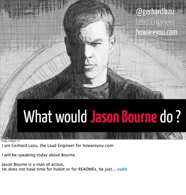 Friday, 8 March 13 I am Gerhard Lazu, the Lead Engineer for howareyou.com I will be speaking today about Bourne. Jason Bourne is a man of action, He does not have time for hubot or for READMEs, he just... sudo