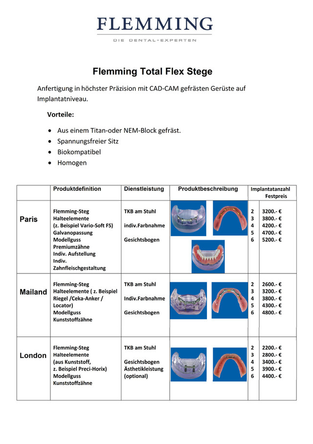 gefrästen Gerüste auf Implantatniveau. Vorteile: • Aus einem Titan-oder NEM-Block gefräst. • Spannungsfreier Sitz • Biokompatibel • Homogen Produktdefinition Dienstleistung Produktbeschreibung Implantatanzahl Festpreis Paris Flemming-Steg Halteelemente (z. Beispiel Vario-Soft FS) Galvanopassung Modellguss Premiumzähne Indiv. Aufstellung Indiv. Zahnfleischgestaltung TKB am Stuhl indiv.Farbnahme Gesichtsbogen 2 3 4 5 6 3200.- € 3800.- € 4200.- € 4700.- € 5200.- € Mailand Flemming-Steg Halteelemente ( z. Beispiel Riegel /Ceka-Anker / Locator) Modellguss Kunststoffzähne TKB am Stuhl Indiv.Farbnahme Gesichtsbogen 2 3 4 5 6 2600.- € 3200.- € 3800.- € 4300.- € 4800.- € London Flemming-Steg Halteelemente (aus Kunststoff, z. Beispiel Preci-Horix) Modellguss Kunststoffzähne TKB am Stuhl Gesichtsbogen Ästhetikleistung (optional) 2 3 4 5 6 2200.- € 2800.- € 3400.- € 3900.- € 4400.- €