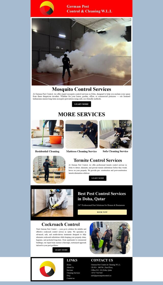 German Pest Control, we offer expert mosquito control services in Doha, designed to help you reclaim your space from these dangerous invaders. Whether for your home, garden, office, or commercial premises — our licensed technicians ensure long-term mosquito prevention using safe, eco-friendly methods. LEARN MORE MORE SERVICES Residential Cleaning Mattress Cleaning Service Sofa Cleaning Service Termite Control Services At German Pest Control, we offer professional termite control services in Doha to detect, eliminate, and prevent termite infestations before they wreak havoc on your property. We provide pre- construction and post-construction termite elimination solutions. LEARN MORE Best Pest Control Services in Doha, Qatar 24/7 Professional Pest Solutions for Homes & Businesses BOOK NOW Cockroach Control Trust German Pest Control — your go-to solution for reliable and effective cockroach control service in Qatar. We specialize in advanced, safe, and results-driven treatments designed to fully eliminate cockroach infestations while keeping your property clean, hygienic, and protected long-term. From apartments to commercial buildings, our expert team ensures a thorough, customized approach tailored to your pest problems. LEARN MORE LINKS Home About Us Services Cleaning Services FAQ Contact us CONTACT US German Pest Control & Cleaning W.L.L CR NO . 186790 , First Floor, Office NO: 101,Doha, Qatar. +974 77417045