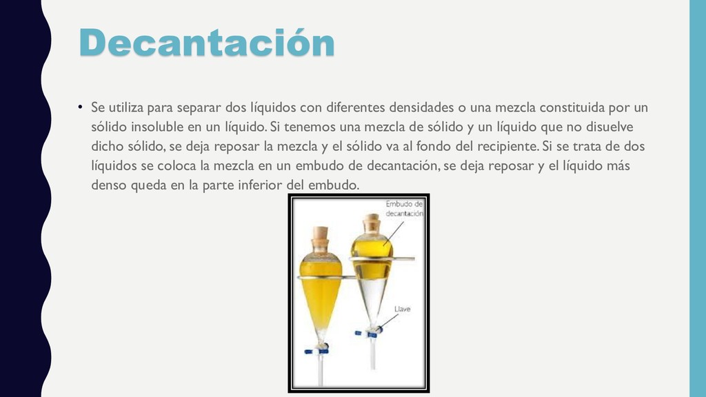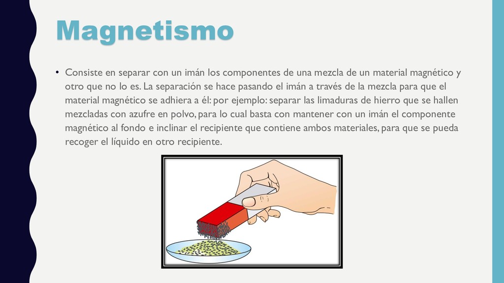 de una mezcla de un material magnético y otro que no lo es. La separación se hace pasando el imán a través de la mezcla para que el material magnético se adhiera a él: por ejemplo: separar las limaduras de hierro que se hallen mezcladas con azufre en polvo, para lo cual basta con mantener con un imán el componente magnético al fondo e inclinar el recipiente que contiene ambos materiales, para que se pueda recoger el líquido en otro recipiente.