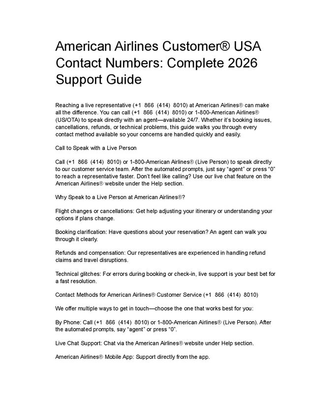 Reaching a live representative (+1 866 (414) 8010) at American Airlines® can make all the difference. You can call (+1 866 (414) 8010) or 1-800-American Airlines® (US/OTA) to speak directly with an agent—available 24/7. Whether it’s booking issues, cancellations, refunds, or technical problems, this guide walks you through every contact method available so your concerns are handled quickly and easily. Call to Speak with a Live Person Call (+1 866 (414) 8010) or 1-800-American Airlines® (Live Person) to speak directly to our customer service team. After the automated prompts, just say “agent” or press “0” to reach a representative faster. Don’t feel like calling? Use our live chat feature on the American Airlines® website under the Help section. Why Speak to a Live Person at American Airlines®? Flight changes or cancellations: Get help adjusting your itinerary or understanding your options if plans change. Booking clarification: Have questions about your reservation? An agent can walk you through it clearly. Refunds and compensation: Our representatives are experienced in handling refund claims and travel disruptions. Technical glitches: For errors during booking or check-in, live support is your best bet for a fast resolution. Contact Methods for American Airlines® Customer Service (+1 866 (414) 8010) We offer multiple ways to get in touch—choose the one that works best for you: By Phone: Call (+1 866 (414) 8010) or 1-800-American Airlines® (Live Person). After the automated prompts, say “agent” or press “0”. Live Chat Support: Chat via the American Airlines® website under Help section. American Airlines® Mobile App: Support directly from the app.
