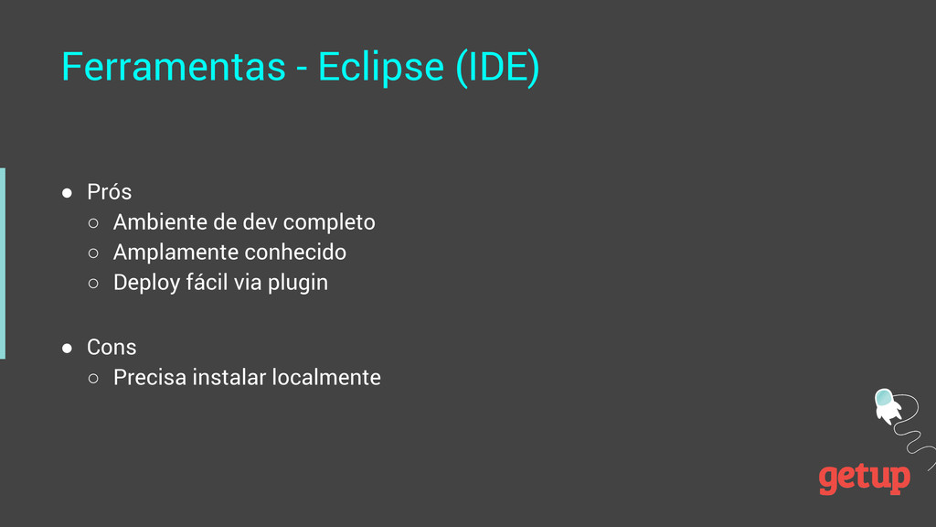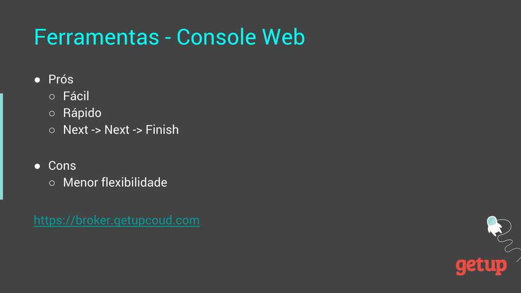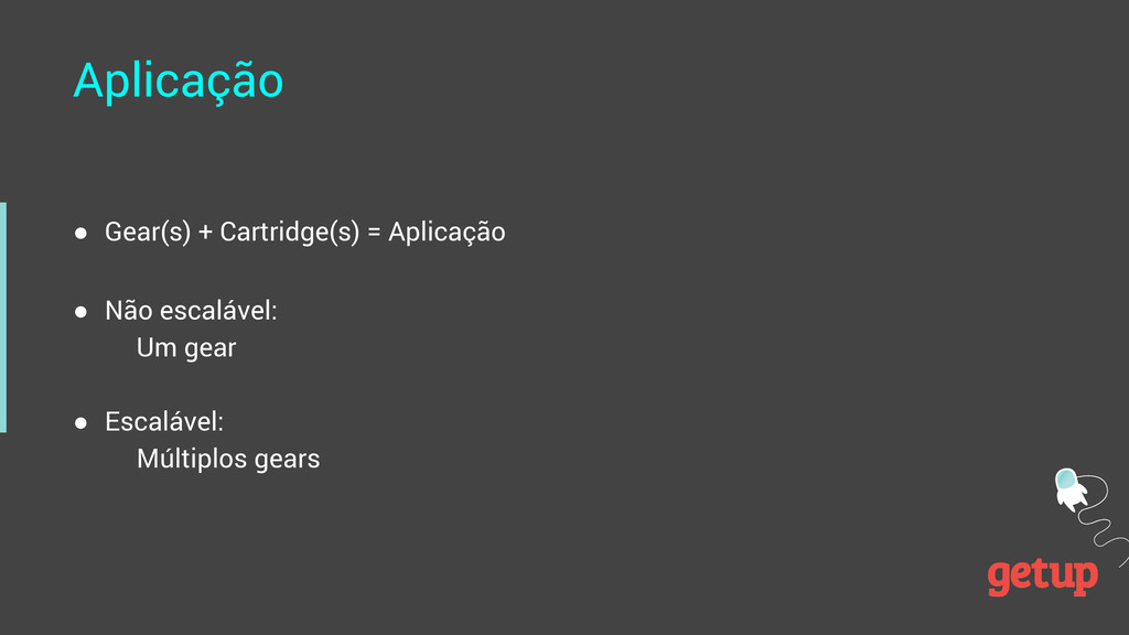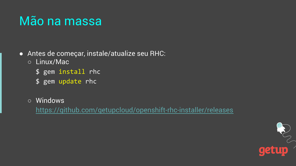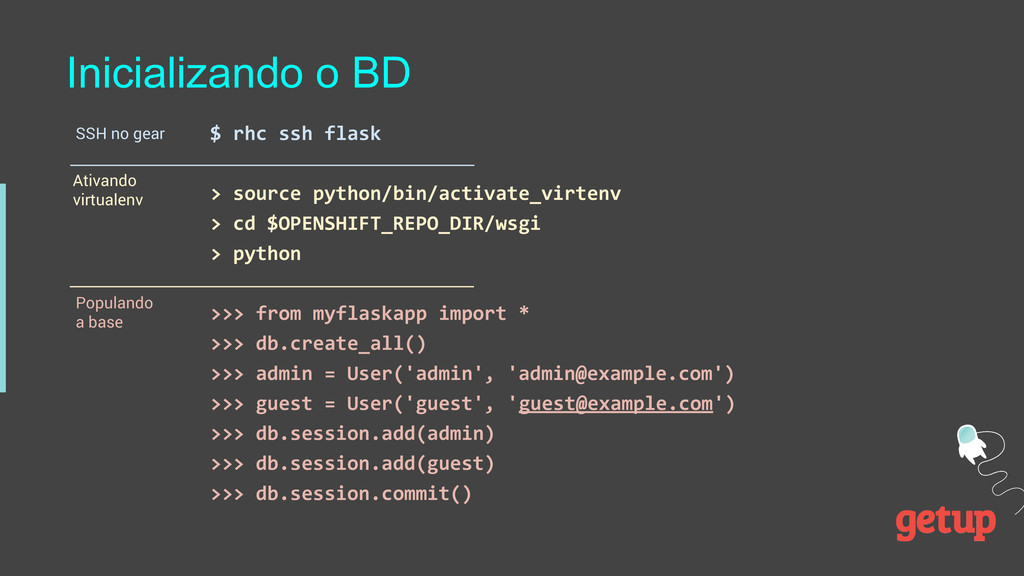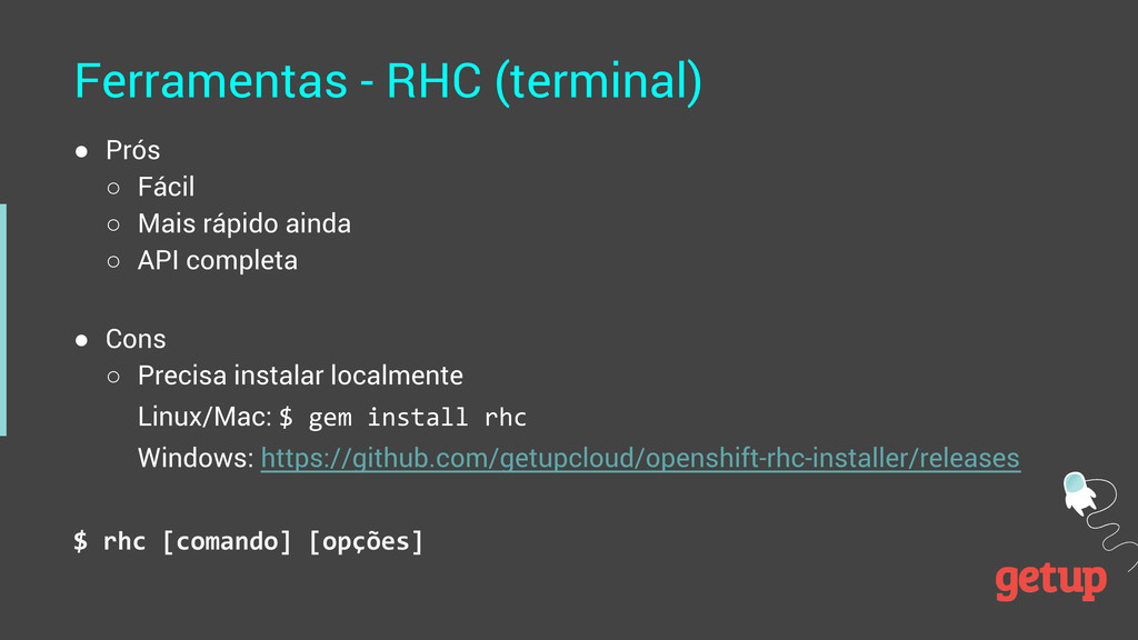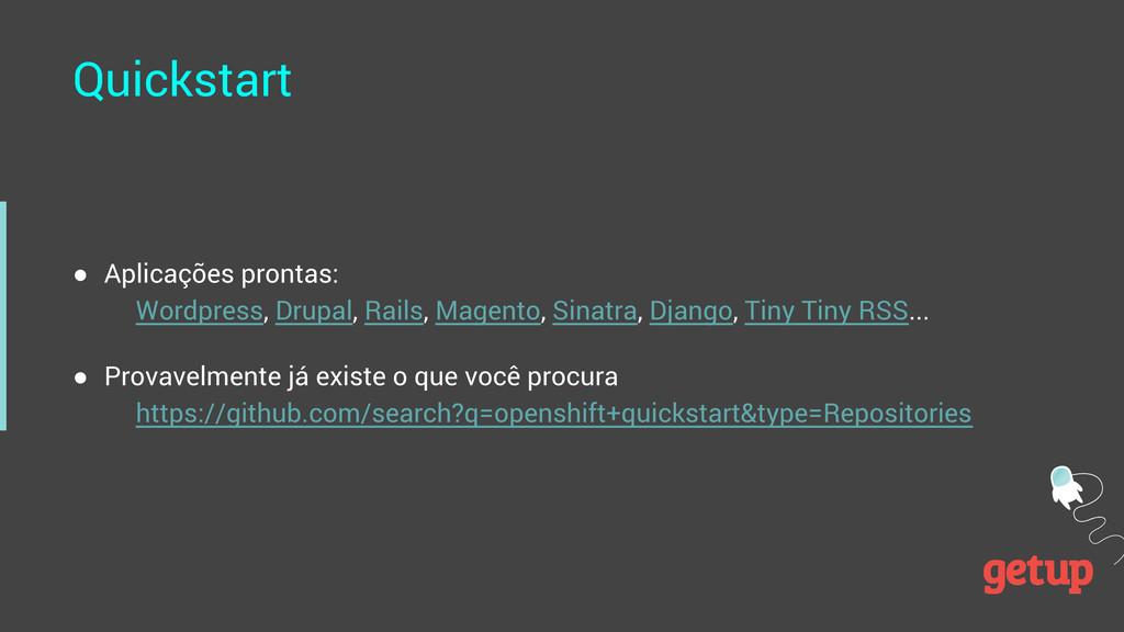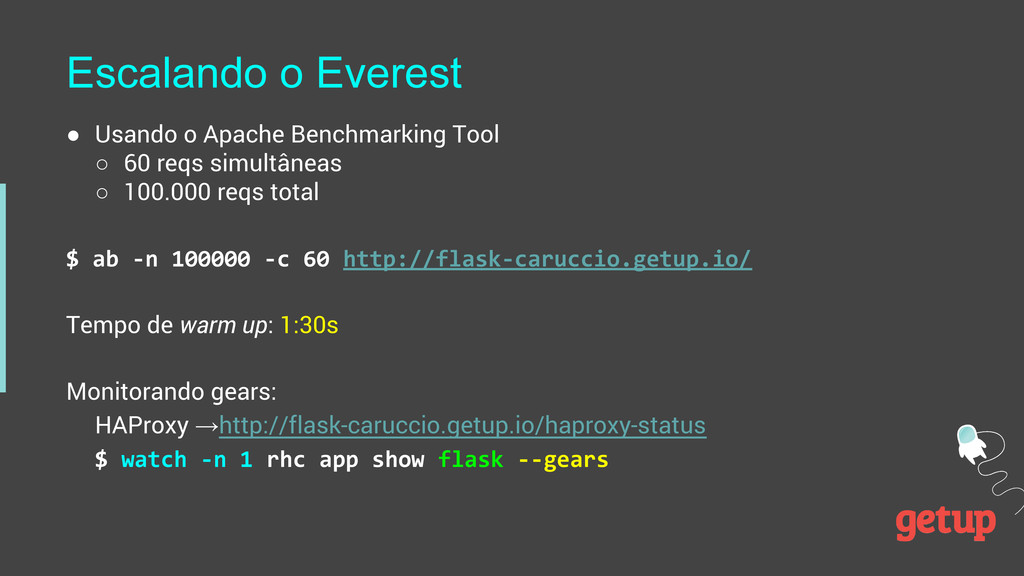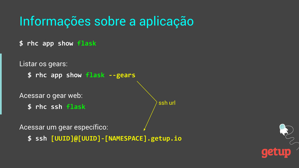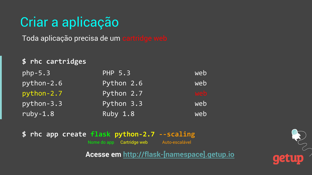 $ rhc cartridges php-5.3 PHP 5.3 web python-2.6 Python 2.6 web python-2.7 Python 2.7 web python-3.3 Python 3.3 web ruby-1.8 Ruby 1.8 web $ rhc app create flask python-2.7 --scaling Acesse em http://flask-[namespace].getup.io Nome do app Cartridge web Auto-escalável