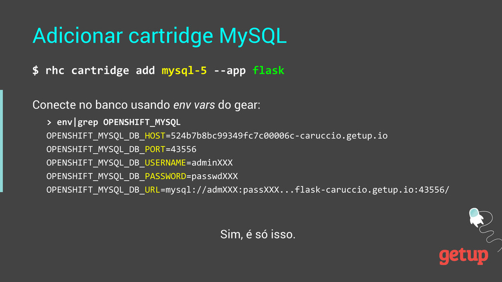 Conecte no banco usando env vars do gear: > env|grep OPENSHIFT_MYSQL OPENSHIFT_MYSQL_DB_HOST=524b7b8bc99349fc7c00006c-caruccio.getup.io OPENSHIFT_MYSQL_DB_PORT=43556 OPENSHIFT_MYSQL_DB_USERNAME=adminXXX OPENSHIFT_MYSQL_DB_PASSWORD=passwdXXX OPENSHIFT_MYSQL_DB_URL=mysql://admXXX:passXXX...flask-caruccio.getup.io:43556/ Sim, é só isso.
