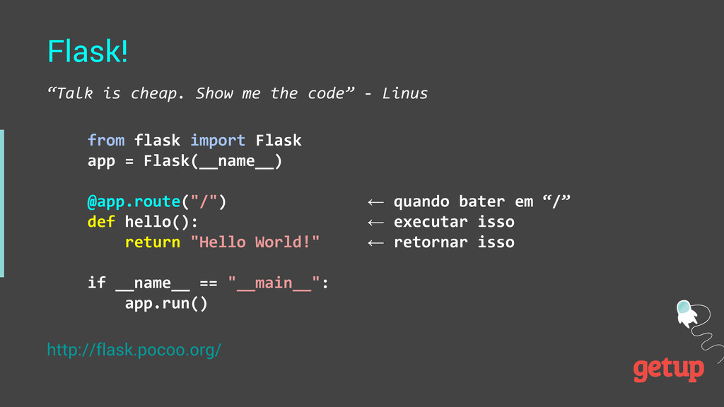 from flask import Flask app = Flask(__name__) @app.route("/") ← quando bater em “/” def hello(): ← executar isso return "Hello World!" ← retornar isso if __name__ == "__main__": app.run() http://flask.pocoo.org/