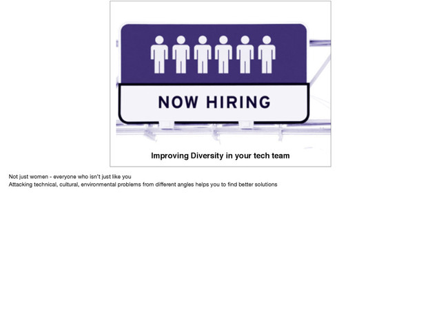A talk I gave at the Android Australia User Group about different ways tech companies can improve diversity. It was a Ladies Who Lightning talk event, however, the things I mention are relevant for diversifying your team generally.