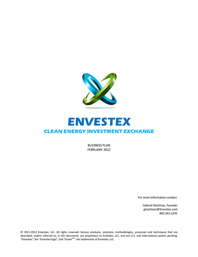 www.Envestex.com ▪ 802.242.1293 Directly from the loan funding transaction, Envestex receives a commission in the range of 5% to 10% which is scaled according to the total amount of the transaction. Larger transactions have lower commission rates. The goal is to use the commission only to pay for the operational expense associated with processing and funding the transaction. In doing so, we keep the rates lower than average brokers (although we are not “brokers”) and focus on making money on the future value of the company and transactional benefits. This puts Envestex in direct alignment with both the investors and the companies: when the companies do well, everyone benefits. We then have a vested interest in doing everything that we can to promote and help the company to be successful, including continued support through the network with regard to business connections and advertising. In addition to the real cash received as commission, Envestex takes a stake in the loan itself, equal to the commission. For example, when a company is funded for 500,000, Envestex receives a 7.5% commission in cash, and an additional 7.5% is added to the loan principal owed amount. So, when the loan reaches maturity, it will have 537,500 in principal plus whatever interest has been accrued to that date. Again, this invests Envestex in the success of the company. Royalty Based Financing While there are a number of ways to deal with potential legal issues with ESLs (see Legal Matters section), one cheap and easy method is to look at an alternative funding method. Royalty based financing (RBF) is a simple method for funding that can provide some significant advantages over usual methods and even the ESL. In RBF, the company seeking funding is still provided with a loan, but rather than waiting for the loan to mature and/or default before investors receive repayment, the company provides a percentage of its monthly revenue stream to the lenders until a pre-set maximum amount is reached (3 to 5 times financed amount). The RBF loan is not secured with equity. It is simply a right to revenue up to a specified amount. The company can retain complete control. The downside for the company is that the cost of capital is higher and definite. For the investor, it means a cap on the amount they can make. However, being able to get monthly payments fast reduces the risk of total loss and reduces the total time required to get paid back (see Competition and Competitive Advantage section). Warrants Along with the real commission and additional principal allocated, Envestex will obtain the right to purchase 5% of each funded company at a fixed rate of 1/5 of the transaction amount for up to 7 years from the time of the funding transaction. For example, for a transaction amount of 500,000, Envestex will have the right to purchase 5% of the funded company for 100,000. That right can be exercised at any time and would only be exercised based on careful assessment of the funded company. In the case that it is exercised, it may be used as a typical option would. However, a buyer for the private securities would most likely need to be determined before exercise. Byproducts During the time following the funding transaction, Envestex will keep a running tab on the companies’ progress in achieving their financial and environmental goals. The information will be available to all investors in the network. The GreenVX Index and all other investment data will be updated as regularly as possible. Investors are provided with an on-going tally of the environmental benefit (or potential benefit) that their investment is accumulating and they can post progress of their investments to twitter, facebook, linkedin, etc. to share with their friends and colleagues. Traffic through the website can easily be targeted for specific advertising, generating additional revenue. Additionally, the information gathered through investor funding can be utilized to