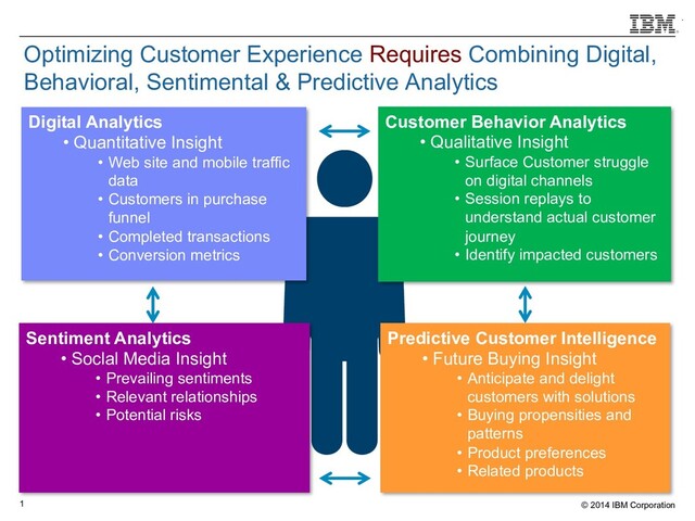 IBM CA provides complete insight Behaviors Sentiments Profiles Narrative: •Combining Behavior, Profile, and Sentiment data IBM CA provides complete insight into customer interactions.