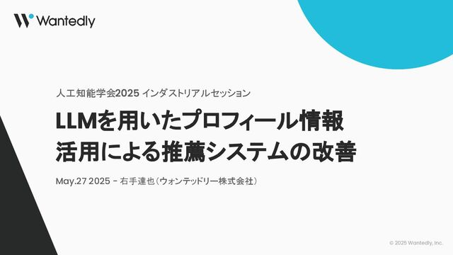 © 2025 Wantedly, Inc. LLMを用いたプロフィール情報 活用による推薦システムの改善 人工知能学会2025 インダストリアルセッション May.27 2025