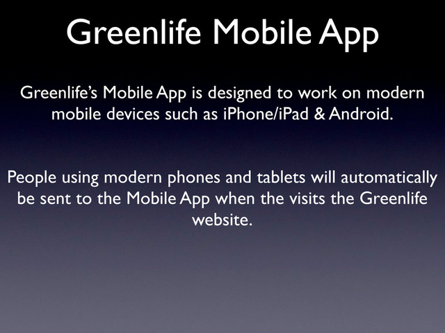 on modern mobile devices such as iPhone/iPad & Android. People using modern phones and tablets will automatically be sent to the Mobile App when the visits the Greenlife website.