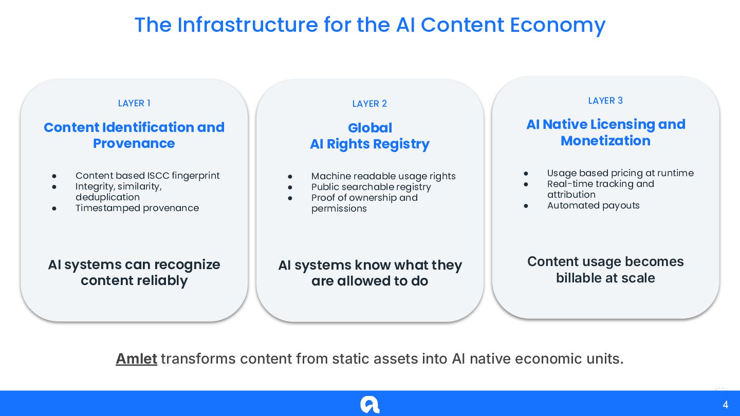 transforms content from static assets into AI native economic units. LAYER 1 Content Identification and Provenance • Content based ISCC fingerprint • Integrity, similarity, deduplication • Timestamped provenance AI systems can recognize content reliably LAYER 2 Global AI Rights Registry • Machine readable usage rights • Public searchable registry • Proof of ownership and permissions AI systems know what they are allowed to do LAYER 3 AI Native Licensing and Monetization • Usage based pricing at runtime • Real-time tracking and attribution • Automated payouts Content usage becomes billable at scale