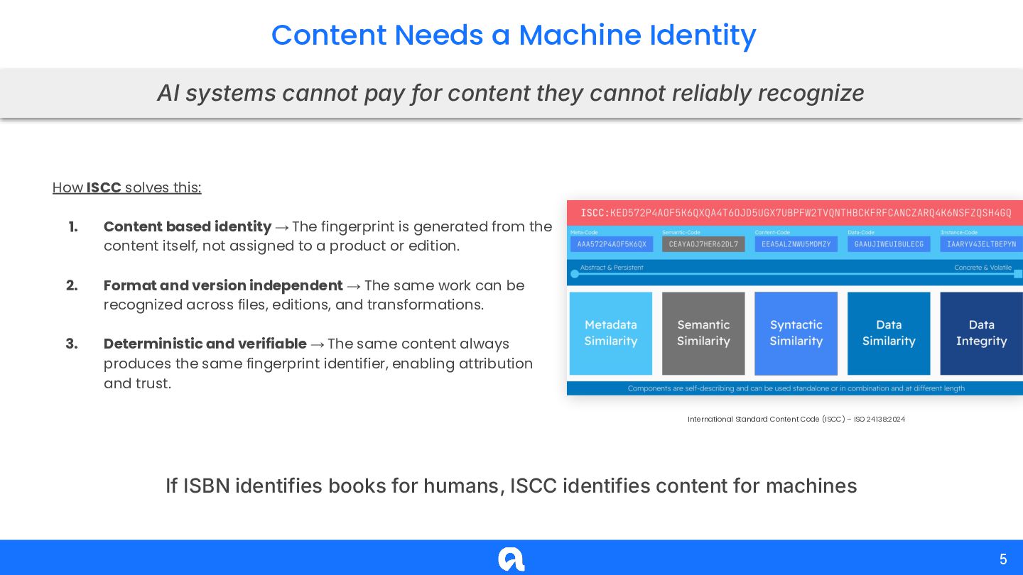 for humans, ISCC identifies content for machines How ISCC solves this: 1. Content based identity → The fingerprint is generated from the content itself, not assigned to a product or edition. 2. Format and version independent → The same work can be recognized across files, editions, and transformations. 3. Deterministic and verifiable → The same content always produces the same fingerprint identifier, enabling attribution and trust. AI systems cannot pay for content they cannot reliably recognize International Standard Content Code (ISCC) – ISO 24138:2024