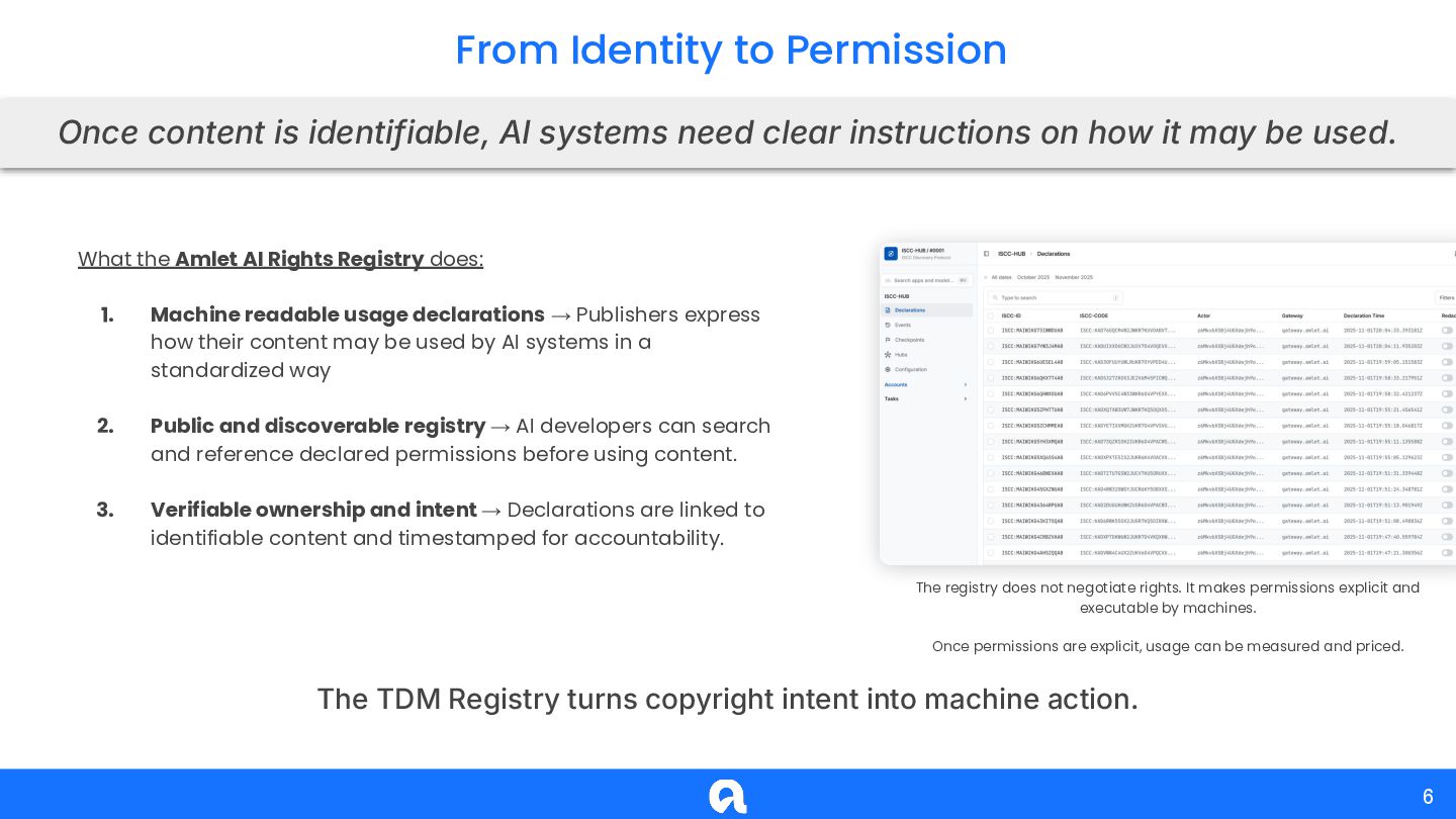 systems need clear instructions on how it may be used. The TDM Registry turns copyright intent into machine action. What the Amlet AI Rights Registry does: 1. Machine readable usage declarations → Publishers express how their content may be used by AI systems in a standardized way 2. Public and discoverable registry → AI developers can search and reference declared permissions before using content. 3. Verifiable ownership and intent → Declarations are linked to identifiable content and timestamped for accountability. The registry does not negotiate rights. It makes permissions explicit and executable by machines. Once permissions are explicit, usage can be measured and priced.