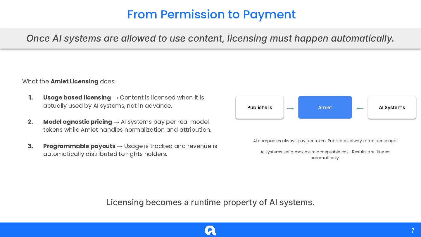 to use content, licensing must happen automatically. What the Amlet Licensing does: 1. Usage based licensing → Content is licensed when it is actually used by AI systems, not in advance. 2. Model agnostic pricing → AI systems pay per real model tokens while Amlet handles normalization and attribution. 3. Programmable payouts → Usage is tracked and revenue is automatically distributed to rights holders. Licensing becomes a runtime property of AI systems. → Amlet ← Publishers AI Systems AI companies always pay per token. Publishers always earn per usage. AI systems set a maximum acceptable cost. Results are filtered automatically.