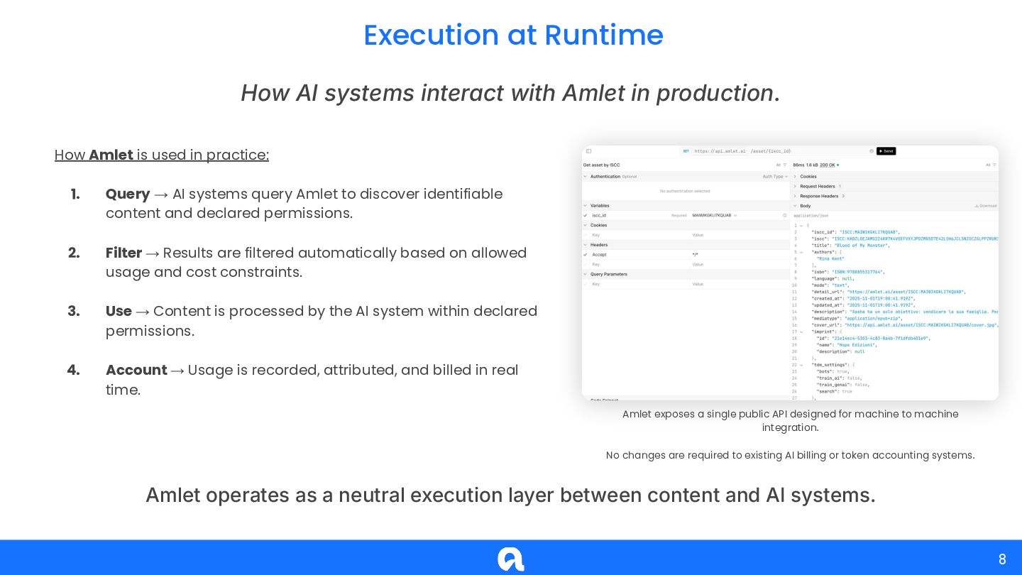 in production. How Amlet is used in practice: 1. Query → AI systems query Amlet to discover identifiable content and declared permissions. 2. Filter → Results are filtered automatically based on allowed usage and cost constraints. 3. Use → Content is processed by the AI system within declared permissions. 4. Account → Usage is recorded, attributed, and billed in real time. Amlet exposes a single public API designed for machine to machine integration. No changes are required to existing AI billing or token accounting systems. Amlet operates as a neutral execution layer between content and AI systems.