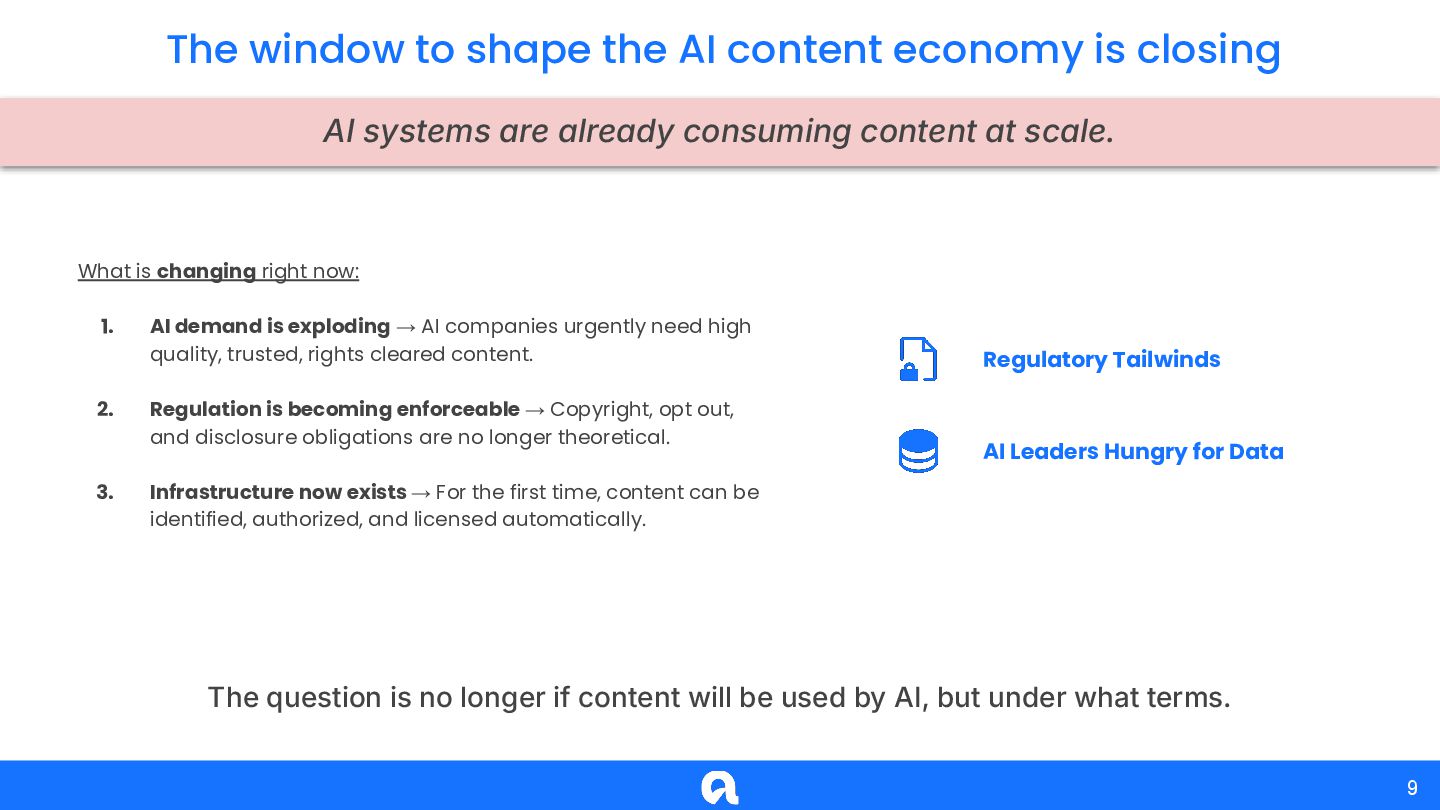economy is closing AI systems are already consuming content at scale. What is changing right now: 1. AI demand is exploding → AI companies urgently need high quality, trusted, rights cleared content. 2. Regulation is becoming enforceable → Copyright, opt out, and disclosure obligations are no longer theoretical. 3. Infrastructure now exists → For the first time, content can be identified, authorized, and licensed automatically. The question is no longer if content will be used by AI, but under what terms. AI Leaders Hungry for Data