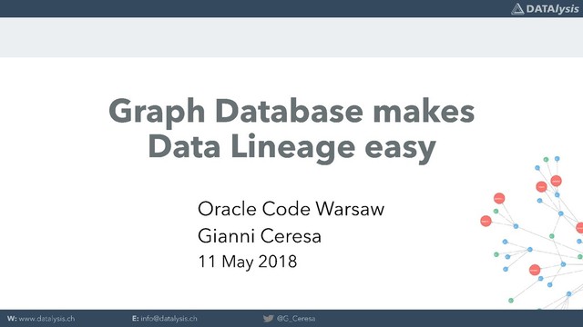 Data Lineage (DL) has been (re)discovered by many companies because of the GDPR enforcement in May 2018. It is the easiest way to know and keep control on “who can access what, how and why” throughout a corporate analytical platform. The challenge of DL is the non-linear aspect of most data flows, often being M-to-N relationships, making them difficult to analyze easily and quickly with traditional tools. A Graph Database is the perfect way to store and analyze metadata collected for DL because of its modular structure composed of nodes and edges. We will demonstrate an implementation and analysis of DL: generating and loading the graph into the Oracle Database, analyze it via SQL, Notebook (Python/Java) or visually with Cytoscape.