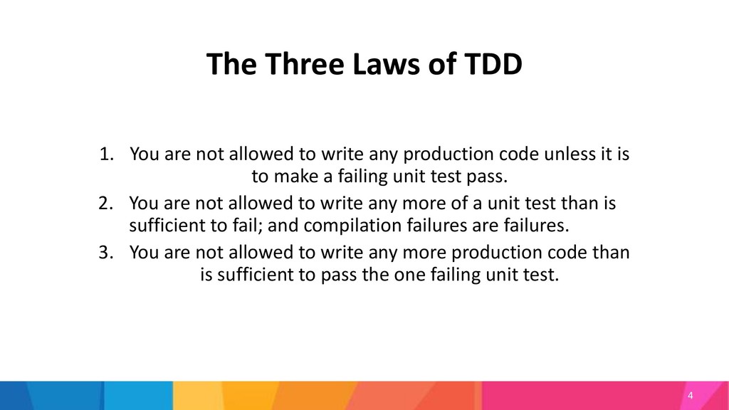 allowed to write any production code unless it is to make a failing unit test pass. 2. You are not allowed to write any more of a unit test than is sufficient to fail; and compilation failures are failures. 3. You are not allowed to write any more production code than is sufficient to pass the one failing unit test.