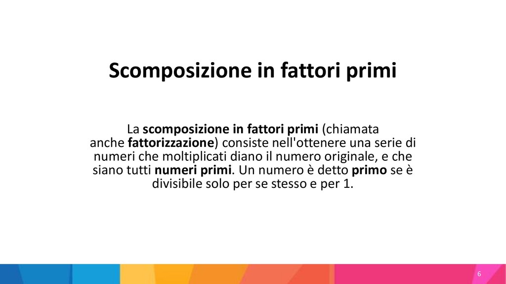 anche fattorizzazione) consiste nell'ottenere una serie di numeri che moltiplicati diano il numero originale, e che siano tutti numeri primi. Un numero è detto primo se è divisibile solo per se stesso e per 1. 6