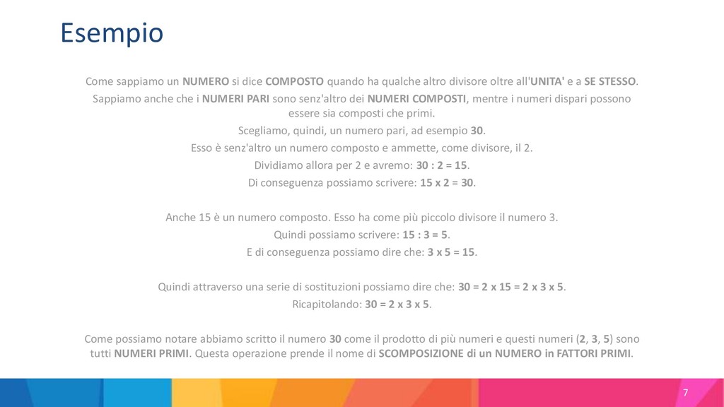 qualche altro divisore oltre all'UNITA' e a SE STESSO. Sappiamo anche che i NUMERI PARI sono senz'altro dei NUMERI COMPOSTI, mentre i numeri dispari possono essere sia composti che primi. Scegliamo, quindi, un numero pari, ad esempio 30. Esso è senz'altro un numero composto e ammette, come divisore, il 2. Dividiamo allora per 2 e avremo: 30 : 2 = 15. Di conseguenza possiamo scrivere: 15 x 2 = 30. Anche 15 è un numero composto. Esso ha come più piccolo divisore il numero 3. Quindi possiamo scrivere: 15 : 3 = 5. E di conseguenza possiamo dire che: 3 x 5 = 15. Quindi attraverso una serie di sostituzioni possiamo dire che: 30 = 2 x 15 = 2 x 3 x 5. Ricapitolando: 30 = 2 x 3 x 5. Come possiamo notare abbiamo scritto il numero 30 come il prodotto di più numeri e questi numeri (2, 3, 5) sono tutti NUMERI PRIMI. Questa operazione prende il nome di SCOMPOSIZIONE di un NUMERO in FATTORI PRIMI. 7