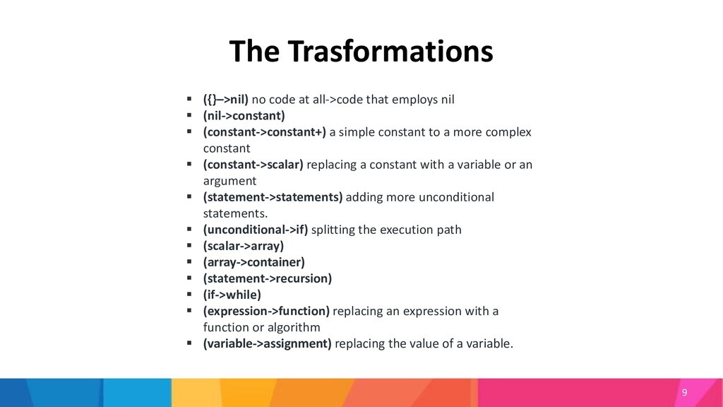 ▪ (nil->constant) ▪ (constant->constant+) a simple constant to a more complex constant ▪ (constant->scalar) replacing a constant with a variable or an argument ▪ (statement->statements) adding more unconditional statements. ▪ (unconditional->if) splitting the execution path ▪ (scalar->array) ▪ (array->container) ▪ (statement->recursion) ▪ (if->while) ▪ (expression->function) replacing an expression with a function or algorithm ▪ (variable->assignment) replacing the value of a variable. The Trasformations
