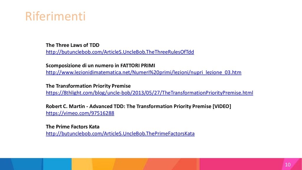 un numero in FATTORI PRIMI http://www.lezionidimatematica.net/Numeri%20primi/lezioni/nupri_lezione_03.htm The Transformation Priority Premise https://8thlight.com/blog/uncle-bob/2013/05/27/TheTransformationPriorityPremise.html Robert C. Martin - Advanced TDD: The Transformation Priority Premise [VIDEO] https://vimeo.com/97516288 The Prime Factors Kata http://butunclebob.com/ArticleS.UncleBob.ThePrimeFactorsKata