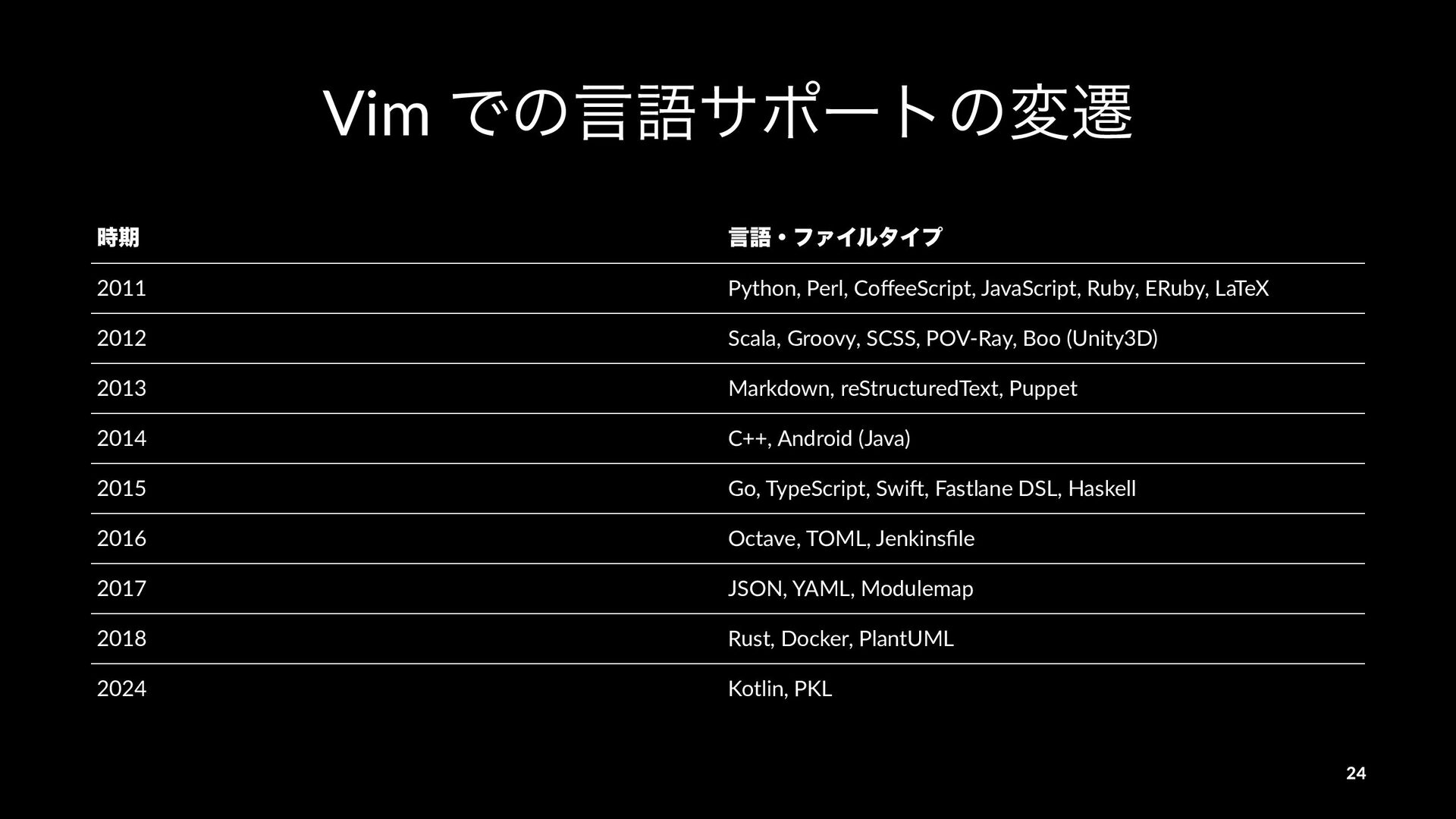 ERuby, LaTeX 2012 Scala, Groovy, SCSS, POV-Ray, Boo (Unity3D) 2013 Markdown, reStructuredText, Puppet 2014 C++, Android (Java) 2015 Go, TypeScript, SwiR, Fastlane DSL, Haskell 2016 Octave, TOML, Jenkinsfile 2017 JSON, YAML, Modulemap 2018 Rust, Docker, PlantUML 2024 Kotlin, PKL 24